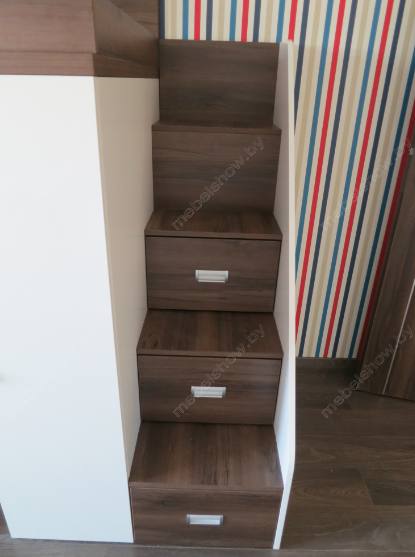 1) Удобная детская двухъярусная кровать с множеством выдвижных ящиков для белья и игрушек и пологой боковой лестницей