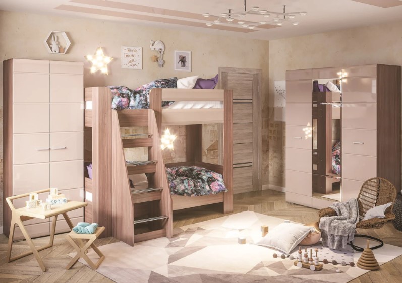 Эстетичная модульная коллекция мебели для обустройства детской комнаты. Материал: МДФ покрытый плёнкой, ЛДСП.