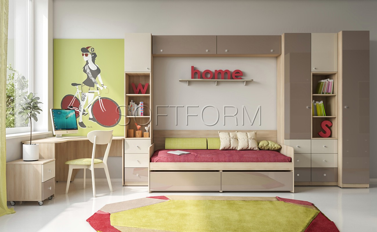 Детская для двоих детей из ЛДСП Egger. Включает кровать-трансформер с мягким изголовьем, кровать в нише, шкаф, оnкрытые полки и рабочее место.