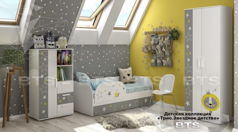 Приглушенный светло-серый фоновый тон фасадов украшен россыпью звезд, отражающихся в счастливых детских глазах. Матовая поверхность створок великолепно оттеняет глянцевое покрытие белых ручек классической прямоугольной формы.
