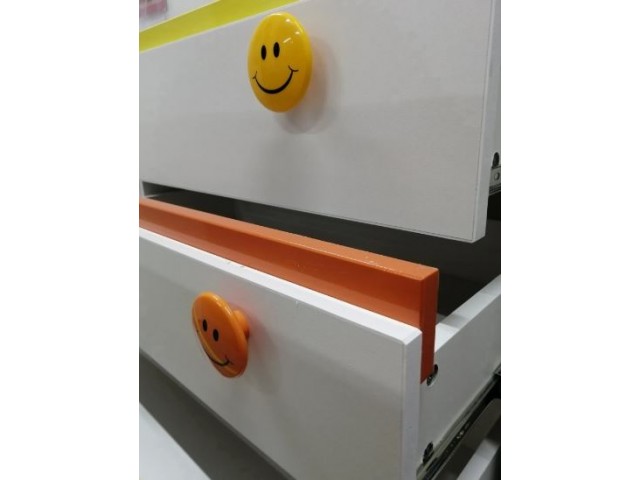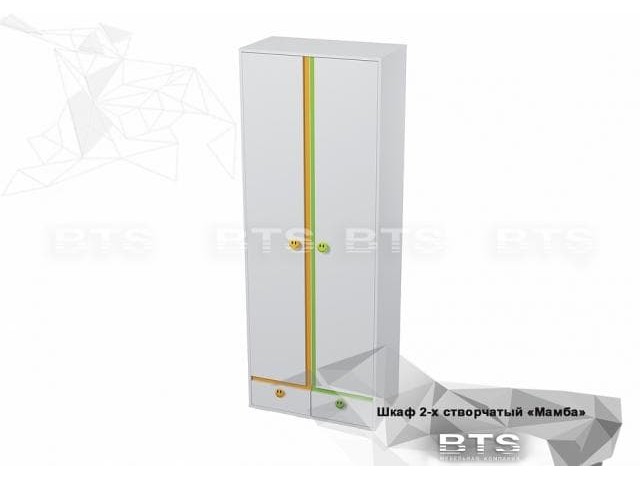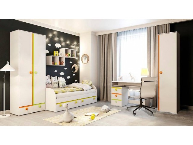 Современная детская модульная коллекция «Мамба» – это яркие краски на белом фоне, простота форм и возможность трансформации. Особенность коллекции – это эффектный контраст цветов: белый фасад с ярко-желтым, оранжевым и зеленым декором. Он позволяет воплощать самые необыкновенные и смелые идеи. Очень эффектно и игриво смотрятся ручки в виде «смайлов» в цвет декора коллекции.