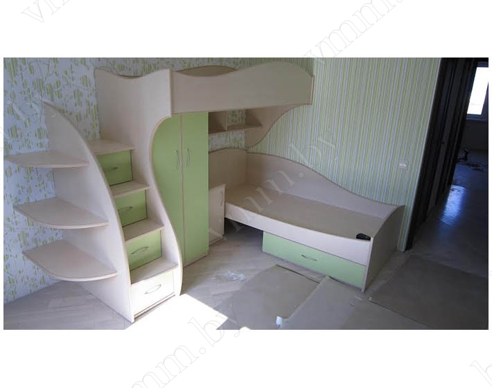 Яркая и удобная детская двухъярусная кровать порадует ваших детей, создаст веселое настроение с самого утра. Модель укомплектована лесенкой для подъема на второй ярус и шкафом. Верхний модуль ообрудован ограждением, призванным защитить вашего непоседу от падения.
