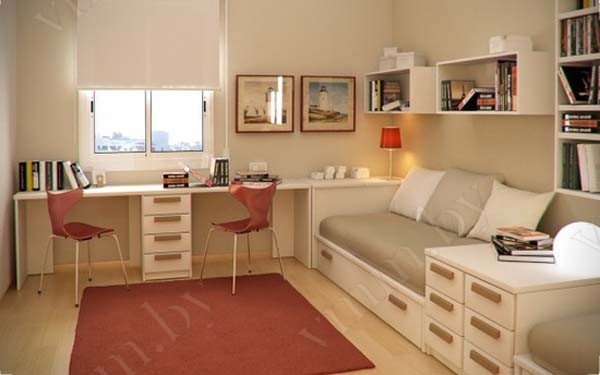 Включает две горизонтальные кровати-трансформеры с мягким изголовьем, рабочий стол и объемную зону для хранения