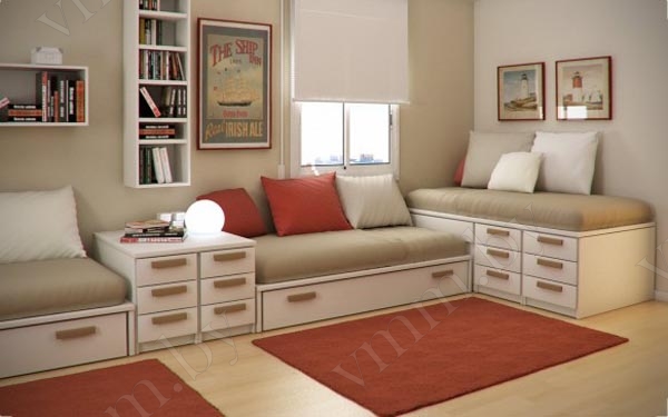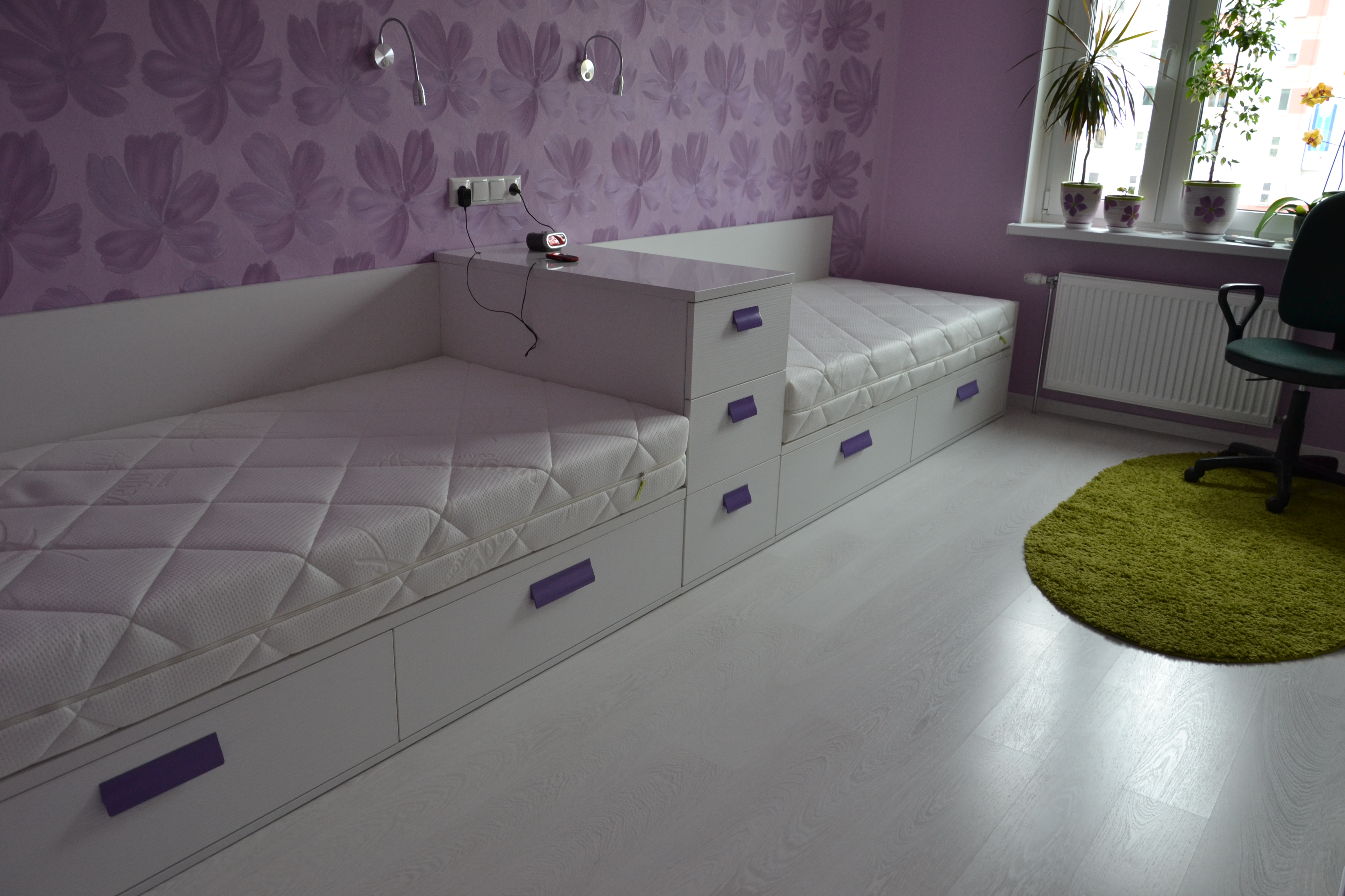 Простой и одновременно привлекательный набор мебели станет отличным подарком для ваших детей. Детские кроватки оснащены ламинированными нишами для белья. В комплект могут входить тумбы и подвесные полки для книг. Размеры и цвет моделей выполняются под заказ.