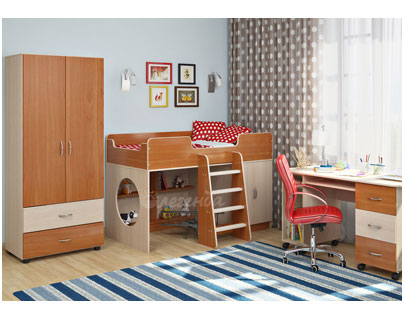 Кровать комплектуется лестницей, ступеньки которой изготовлены из натурального дерева. Шкаф оборудован двумя полками для белья.