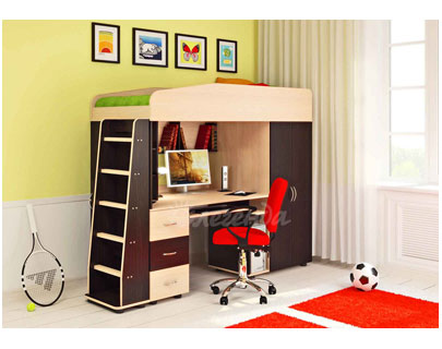 Детская мебель со шкафом «Легенда 1» представляет собой функциональную конструкцию, оборудованную кроватью, стеллажом для книг, шкафом и тумбой с тремя вместительными выдвижными ящиками.