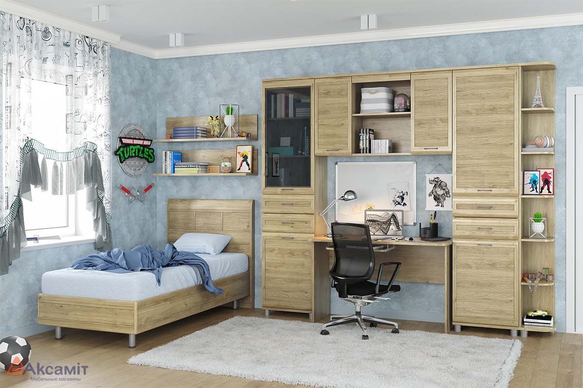 В комплекте: Шкаф (1 шт.), кровать-90 (1шт.), комод (1 шт.), стол (1 шт.), полка (1шт.).
