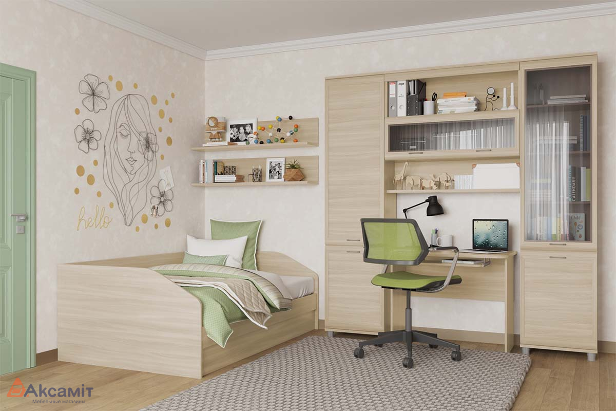 Двухдверный шкаф-купе для одежды, широкий письменный стол, подвесная книжная полка.