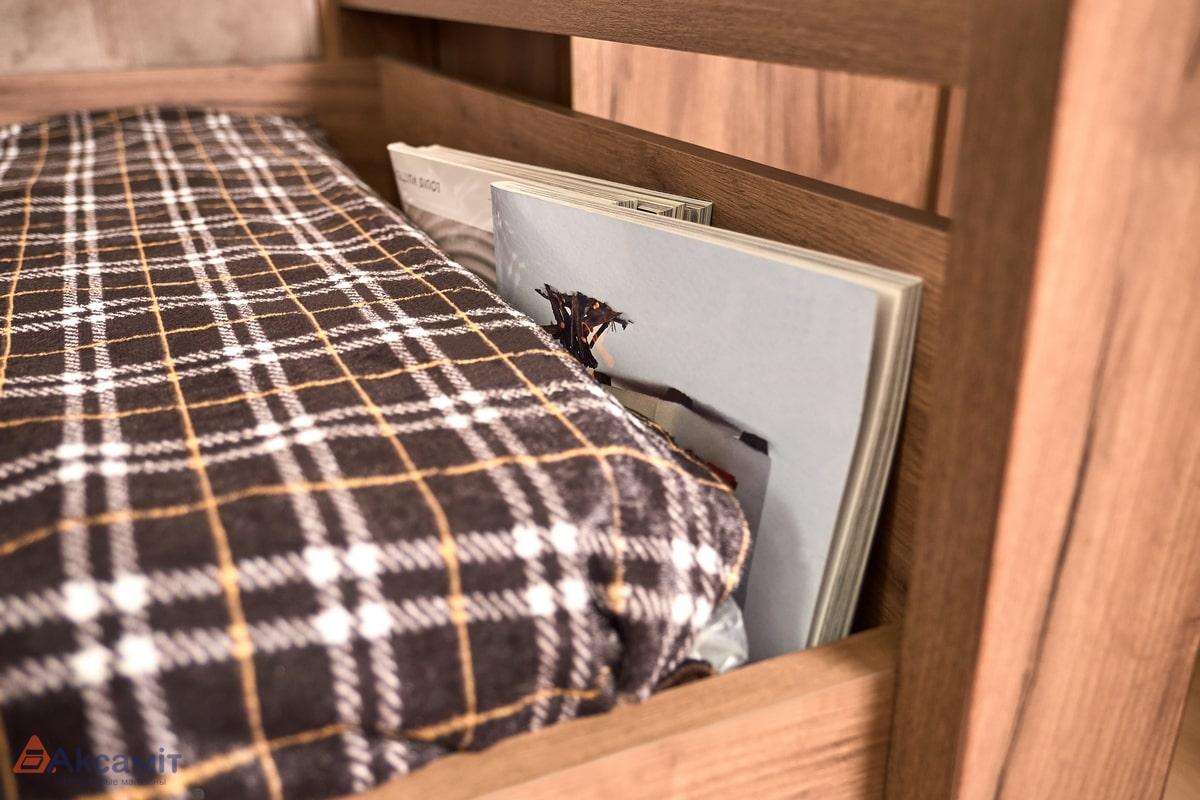 Детская или подростковая кровать-тахта с большим выдвижным ящиком. Дно усилено специальными рёбрами жёсткости из фанеры 18 мм и рассчитано на нагрузку до 80 кг, что позволяет пользоваться кроватью даже школьникам старших классов.