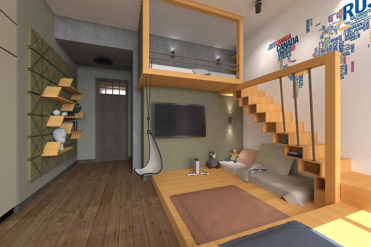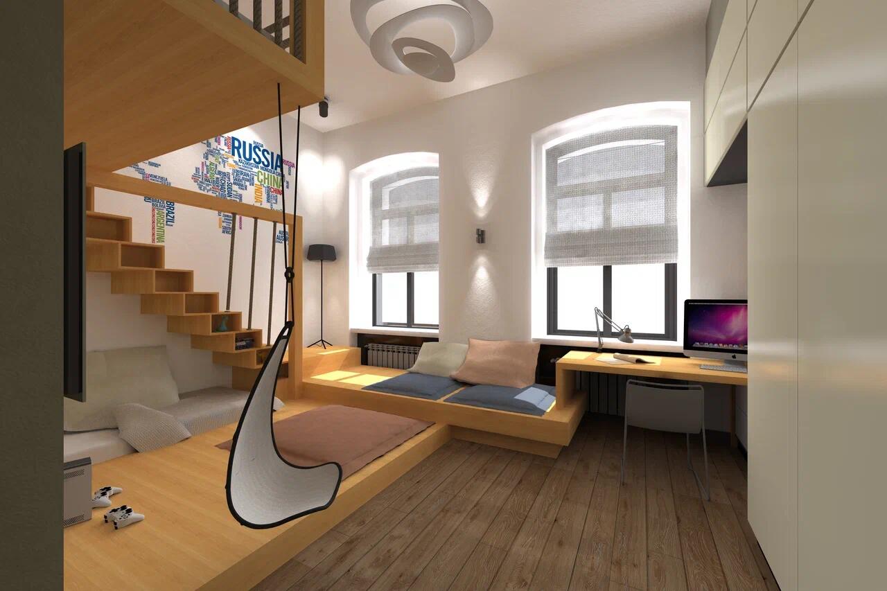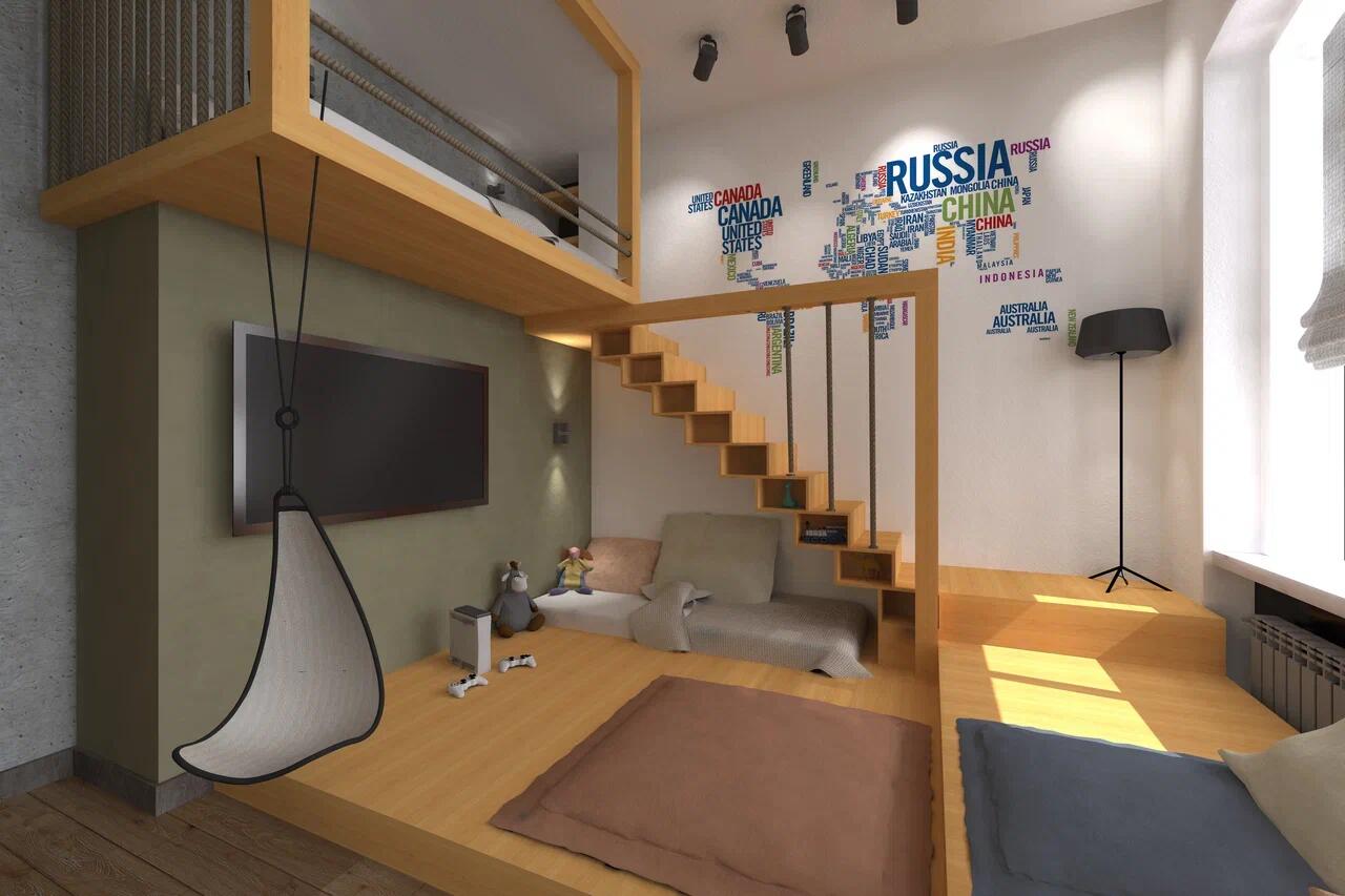 Подростковая современная комната в помещении с высокими потолками. Для использования пространства по максимуму, сделали второй этаж со спальным местом. В дизайне преобладают природные спокойные оттенки.