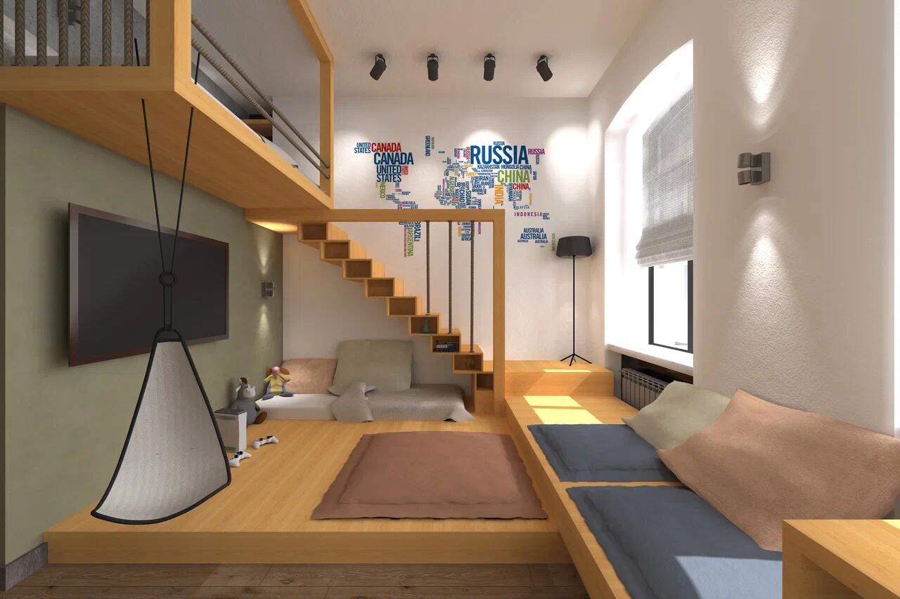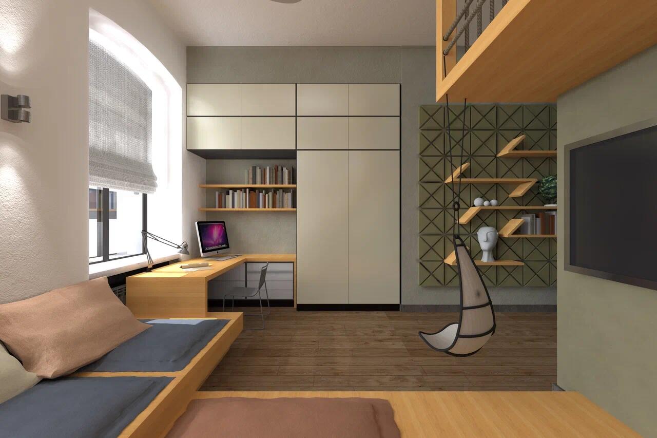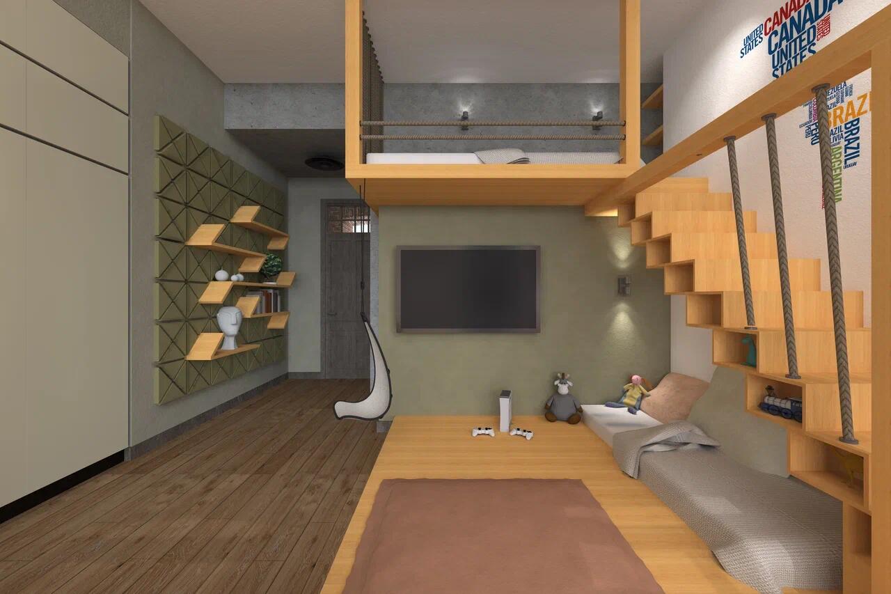Подростковая современная комната в помещении с высокими потолками. Для использования пространства по максимуму, сделали второй этаж со спальным местом. В дизайне преобладают природные спокойные оттенки.