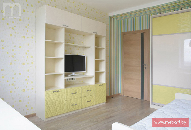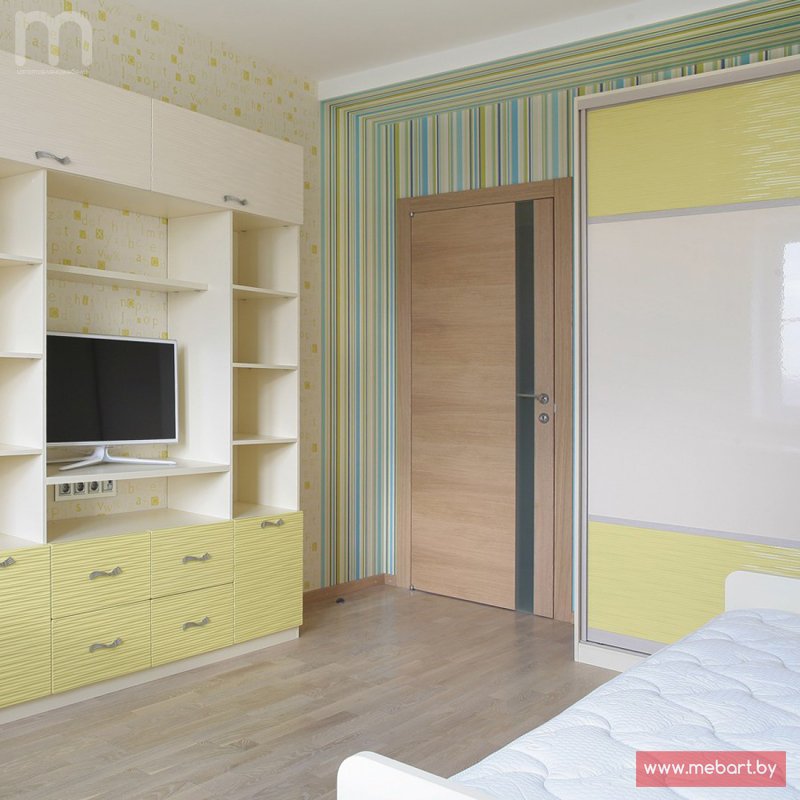 Коллекция модульной мебели для детской в светло-кремовой гамме. Материал: ЛДСП, МДФ.