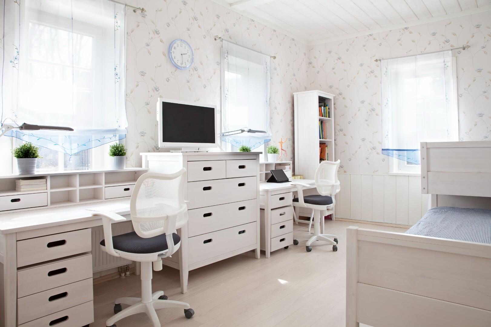 Состав проекта: удобная и вместительная двухместная разноуровневая кровать со спальными местами 90 на 200 см. Два рабочих стола с подкатными тумбами и надставками для мелочей. 2 компактных, но вместительных шкафа и комод.