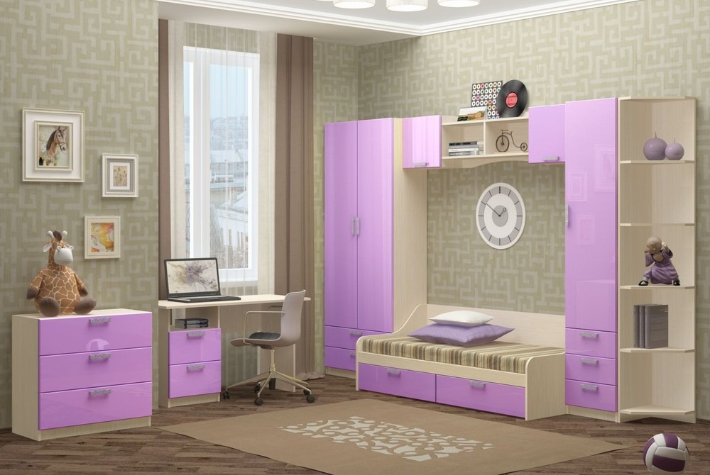 Шикарный комплект с фасадами МДФ для детской комнаты. Есть все самое необходимое для ребенка: шкафы, стол, кровать и комод. В кровати снизу расположены выдвижные ящики для хранения белья.