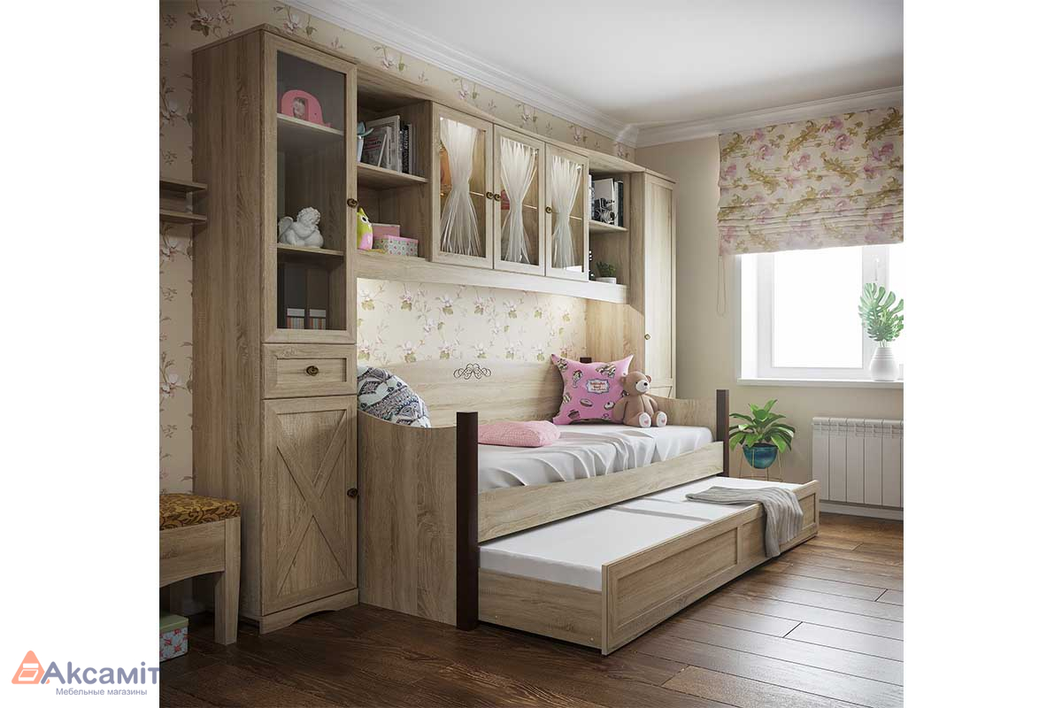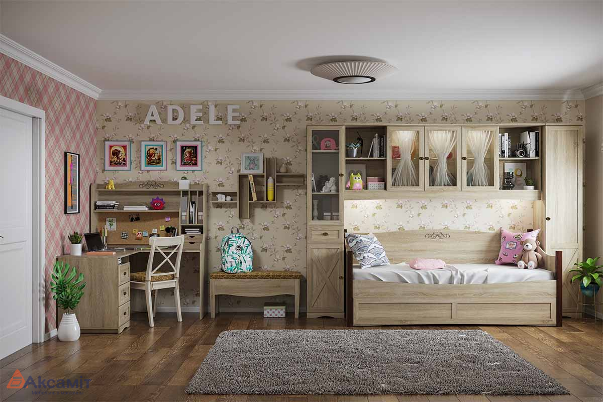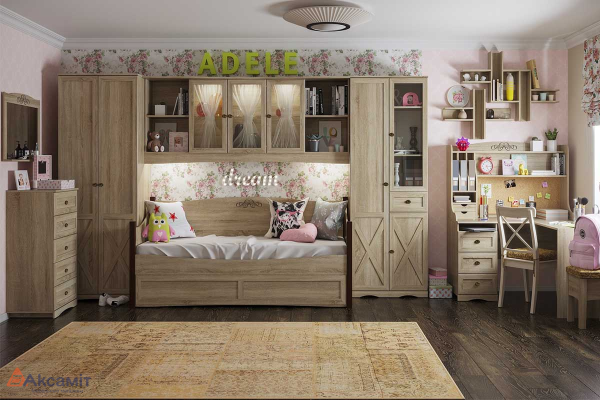 Молодежная коллекция ADELE создана специально для маленьких принцесс. Гарнитур в стиле Прованс несет в себе особое очарование, ощущение гармонии и простоты, великолепие природы, полей душистой лаванды, необычайную легкость воздуха и игру солнечных бликов. Для коллекции подобран декор Дуб Сонома с текстурой натуральной древесины, с мягким и теплым оттенком, поэтому и зимой, и летом в такой светлой спальне будет уютно.