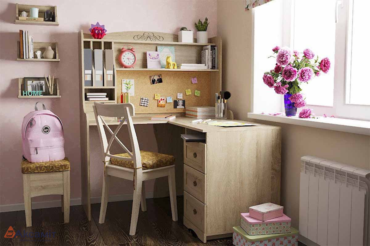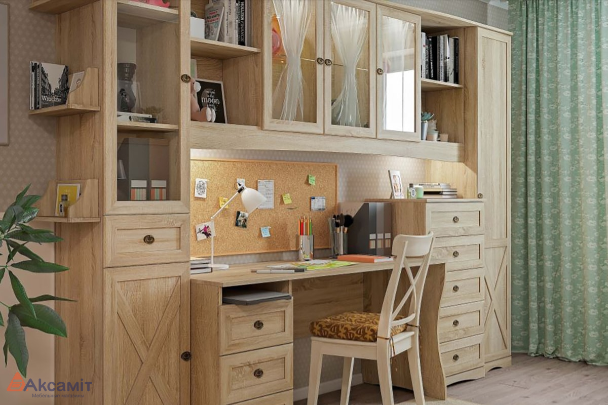 В комплекте: Шкаф (1 шт.), кровать-90 (1шт.), комод (1 шт.), стол (1 шт.), полка (1шт.).