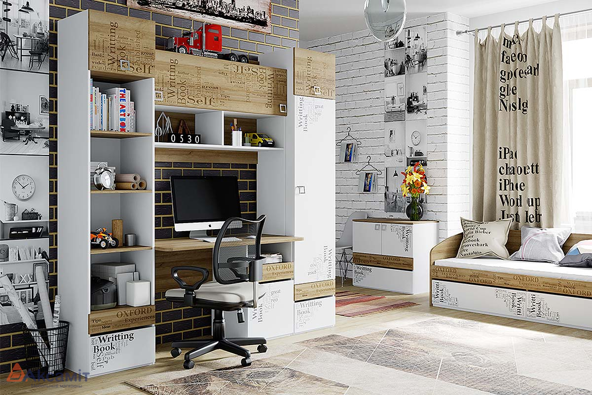 Набор мебели «Оксфорд» станет универсальным решением для формирования детской комнаты. Поскольку все модули выполнены в едином стиле, нет необходимости долго подбирать элементы интерьера, следя за тем, чтобы они сочетались между собой. Эта мебель отвечает высочайшим стандартам качества. Она выполнена из прочного ЛДСП класса эмисси Е-0,5, поэтому не оказывает негативного влияния на здоровье.