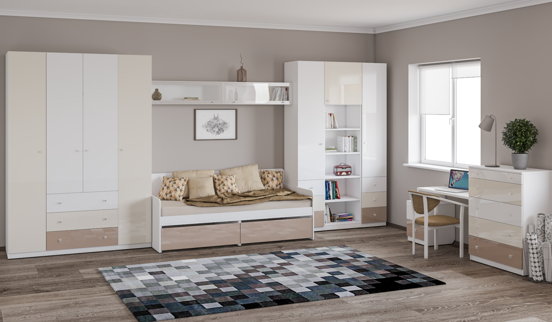 Модульный набор мебели для детской в приятных кремово-кофейных тонах. Материал: ЛДСП.