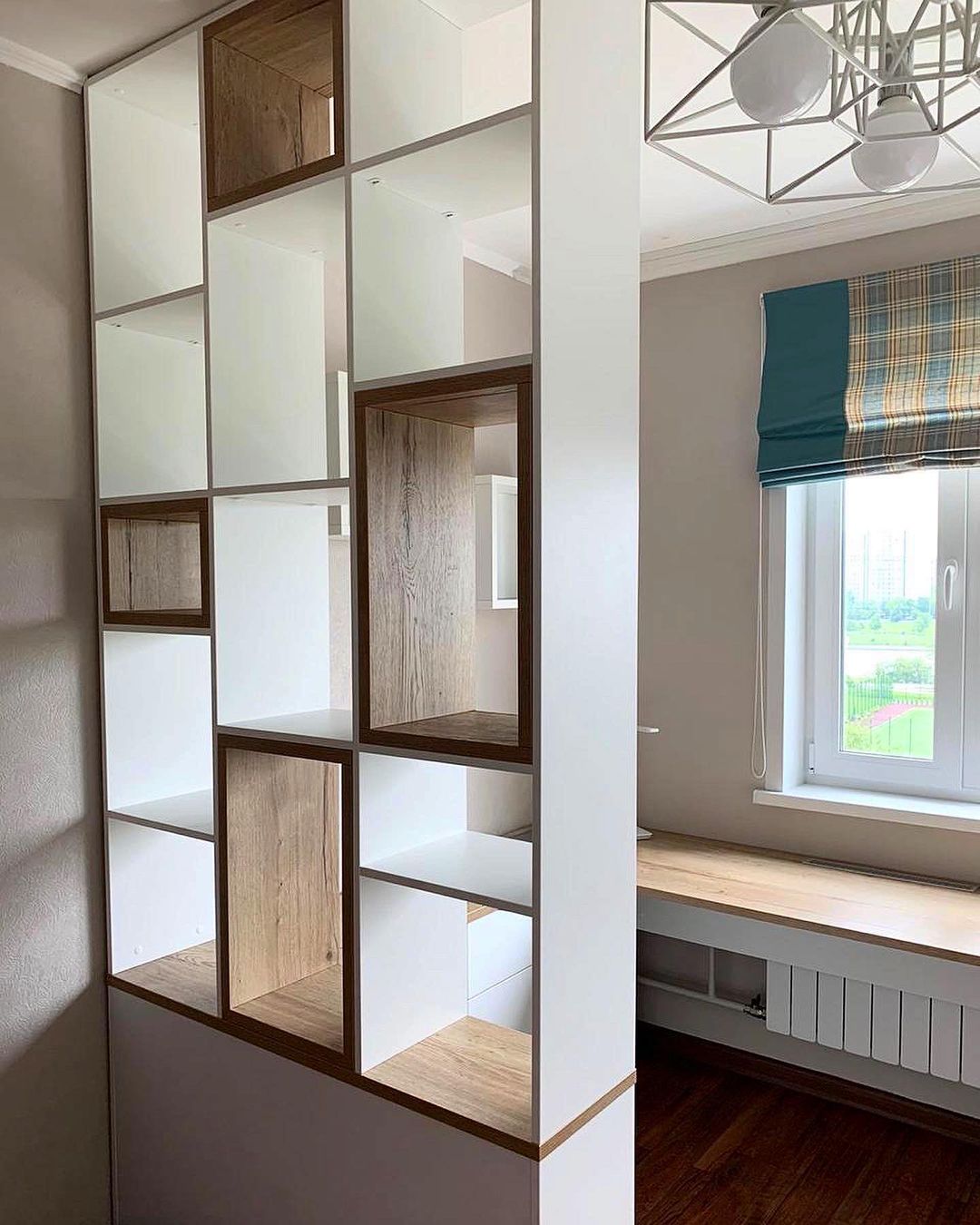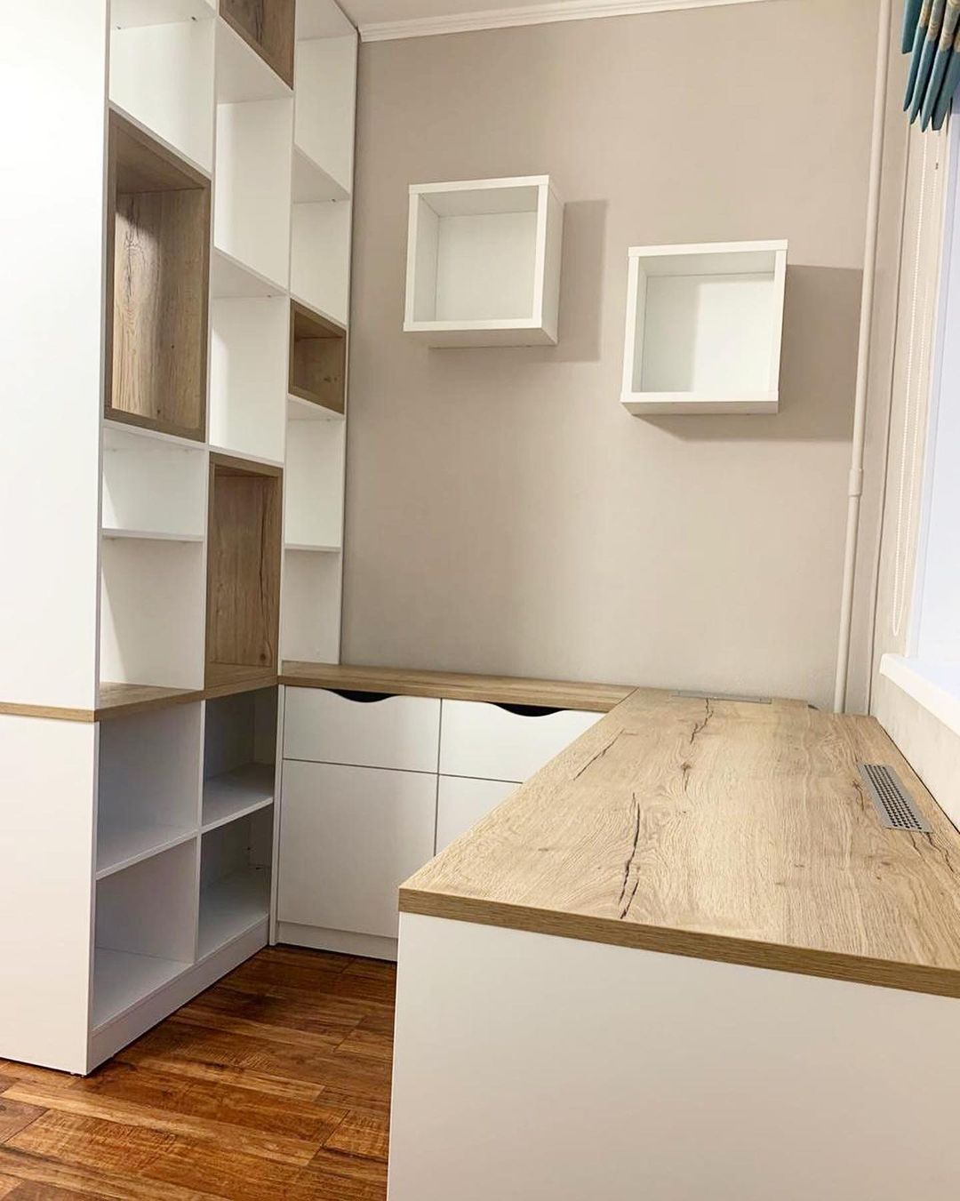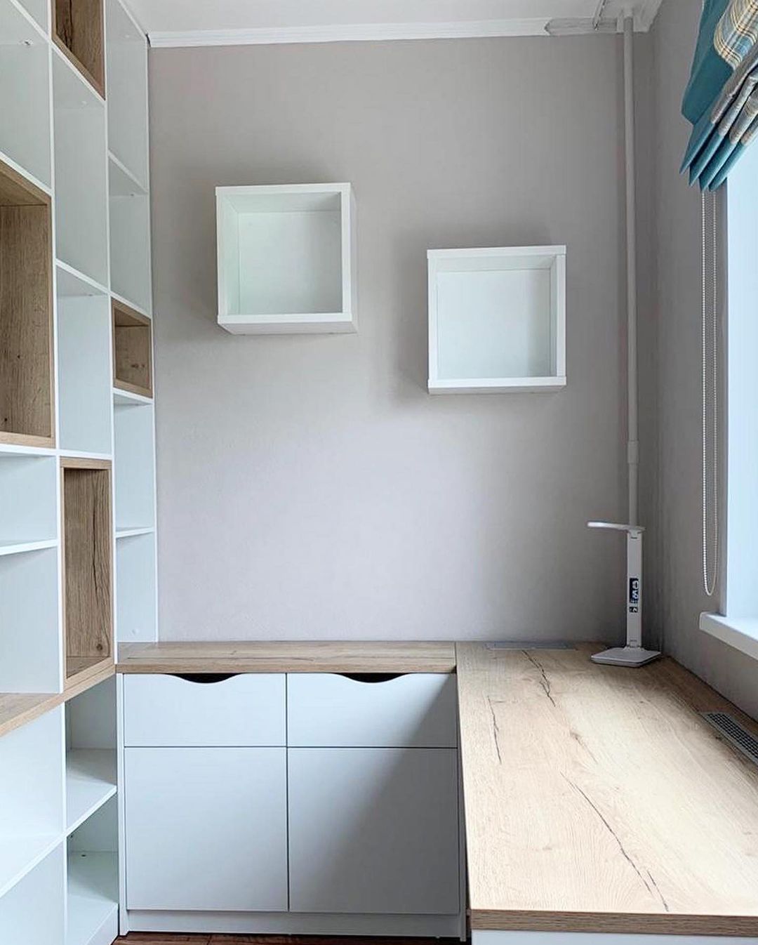 Стильное решение для организации рабочего места и зоны хранения вещей.