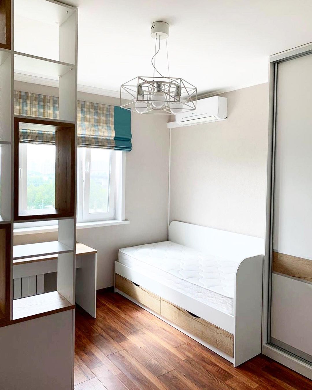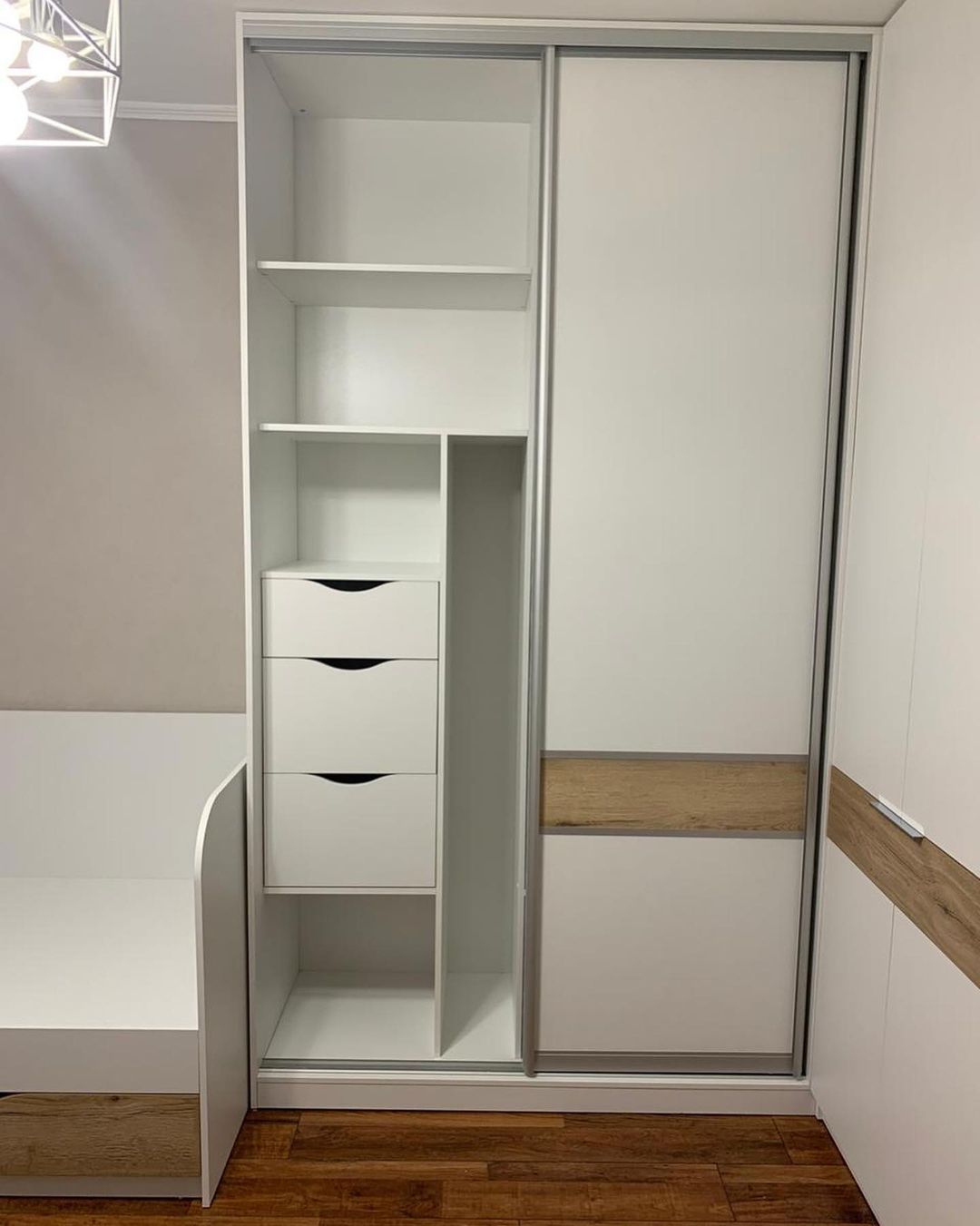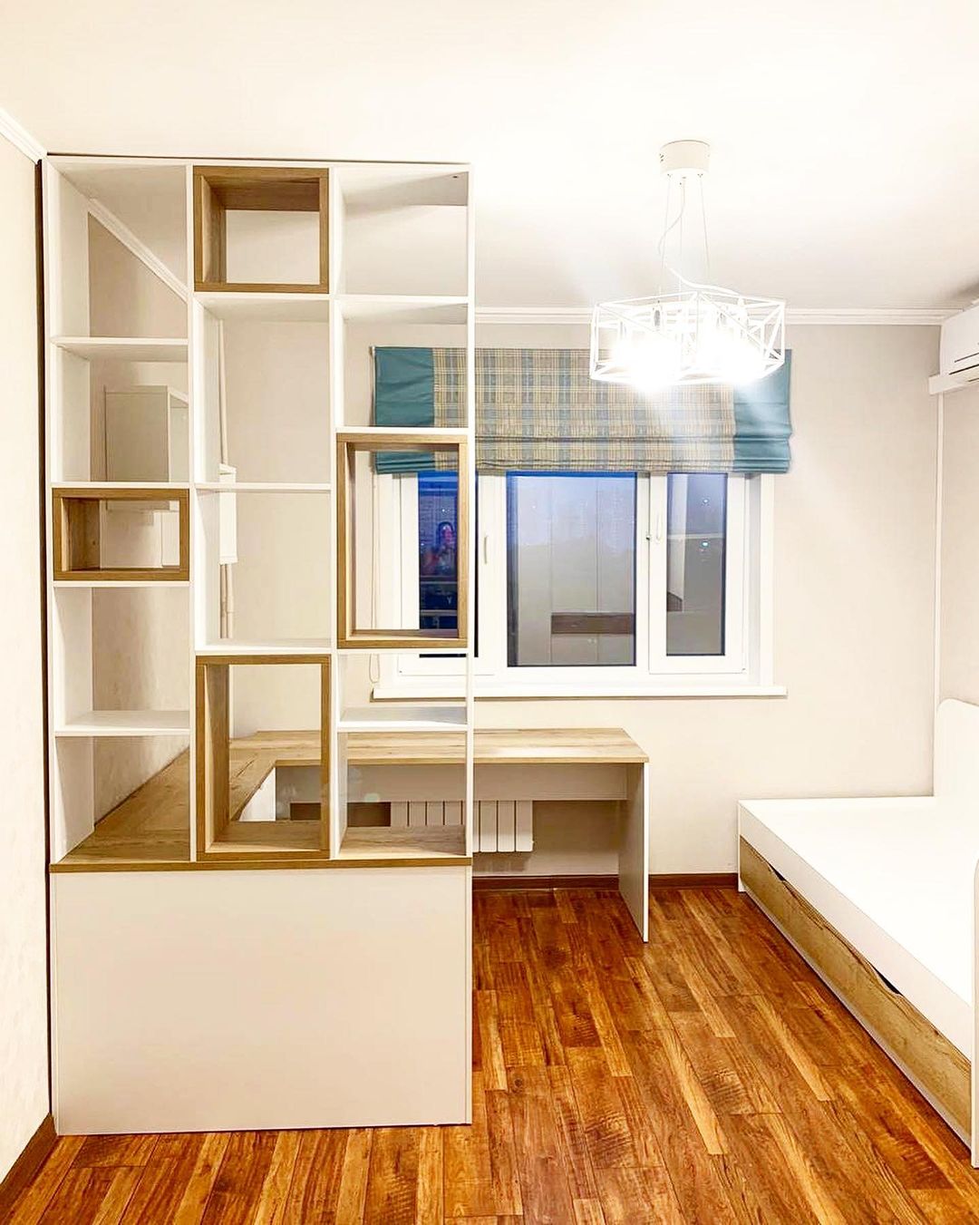 Стильное решение для организации рабочего места и зоны хранения вещей.