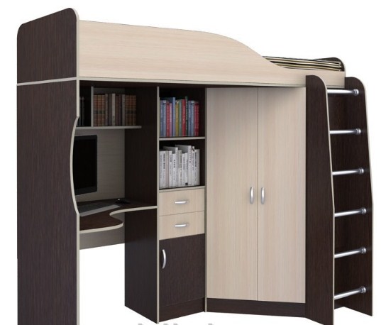 В случае, если выделенная для ребенка комната или территория отличается очень маленькими габаритами, то представленная модель кровать-чердак может стать настоящим спасением, так как в ней имеются все элементы, которые необходимы для полноценного отдыха и развития ребенка, а также достаточное количество места для хранения самых разнообразных вещей. Кровать-чердак имеет очень устойчивую и прочную конструкцию с размещением спального места на втором ярусе, что делает отдых ребенка даже интересней. На нижнем ярусе размещается достаточно вместительный двустворчатый шкаф и компьютерный стол в открытыми полками для книг и учебников.