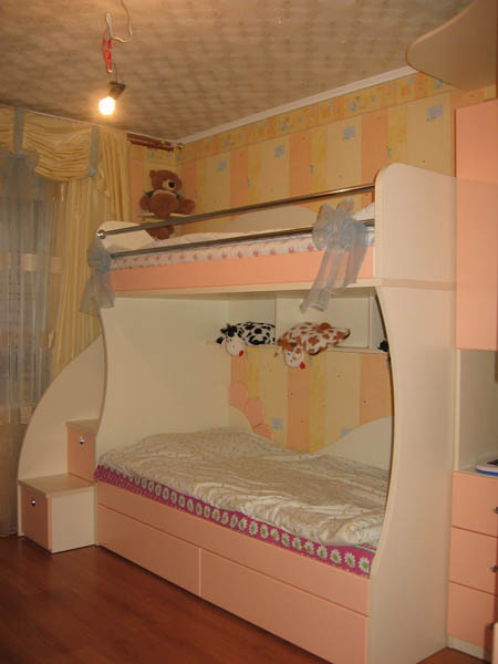Помимо своей основной функции, лесенка на второй ярус берет на себя функцию места для хранения. Так же функционально использовано место под кроватью - оборудованы выдвижные ящики.