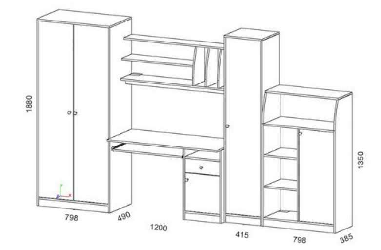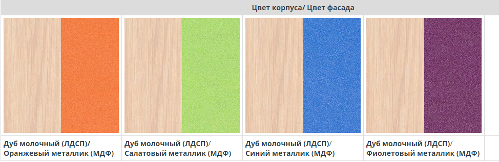 Вместительный набор мебели для детской выполнен из МДФ и ЛДСП. Цвет корпуса — дуб молочный, фасад окрашен в салатовый или оранжевый металлик на выбор заказчика. В комплекте представлено множество открытых полочек для книг и игрушек, шкаф для одежды, небольшой шкаф-пенал и несколько тумб. Имеется также компактный стол с выдвижной полочкой для клавиатуры. По желанию покупателя модель может комплектоваться удобной кроватью.