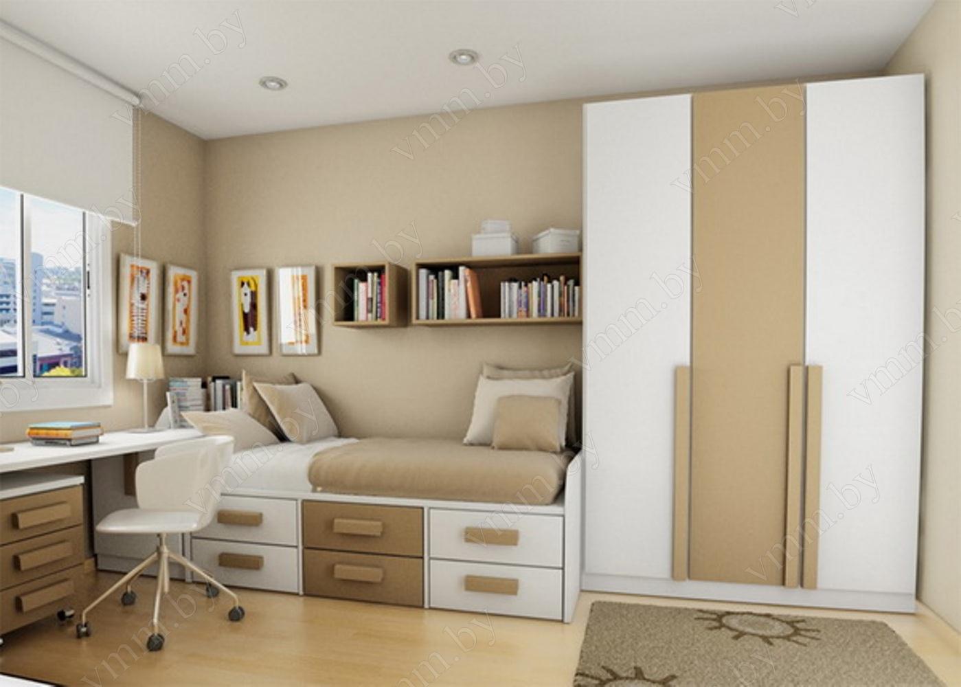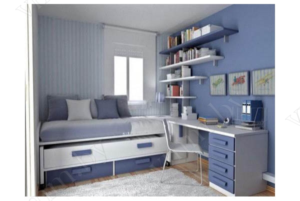 Набор мебели для подростка укомплектован всем необходимым. Спальное место представляет собой кровать с выдвижными ящиками, которая также может быть использована как диван.