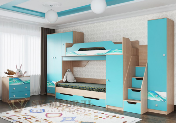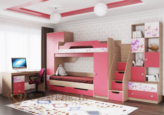 Мебель для детской комнаты очень подойдет семье с двумя детьми. В комплекте двухъярусная кровать, на котрую легко подниматься. Также присутствует большой платяной шкаф для одежды вашего ребенка.