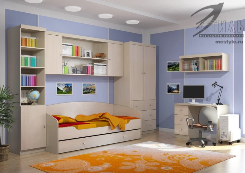Угловой письменный стол, кровать с ящиками, два пенала, антресоль с полками.