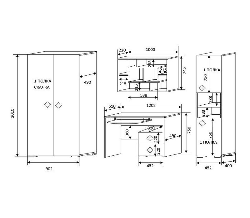 Стильное решение для организации рабочего места и зоны хранения вещей.