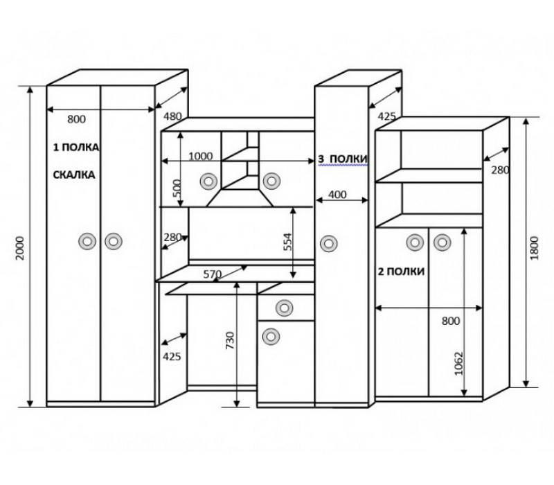 Комплектация: Шкаф платяной, стол с тумбой, полкой для клавиатуры и надстройкой, пенал для вещей и шкаф для документов и принадлежностей