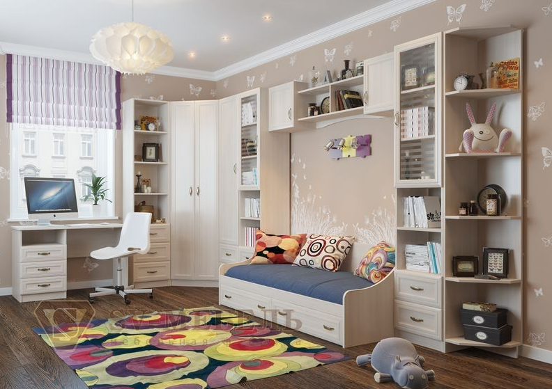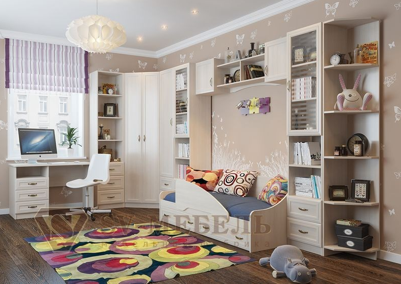 Гарнитур выполнен в светлых оттенках, что позволит зрительно расширить и увеличить пространство. Модульная система поможет создать неповторимую мебельную композицию в комнате вашего ребенка.