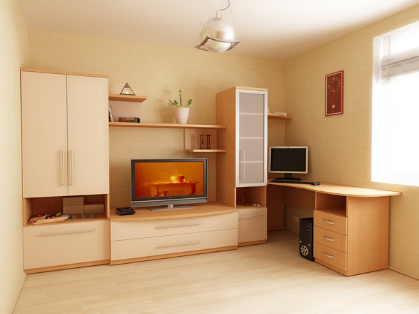 Модульный набор корпусной мебели. Кровать, шкаф, полки, рабочее место.