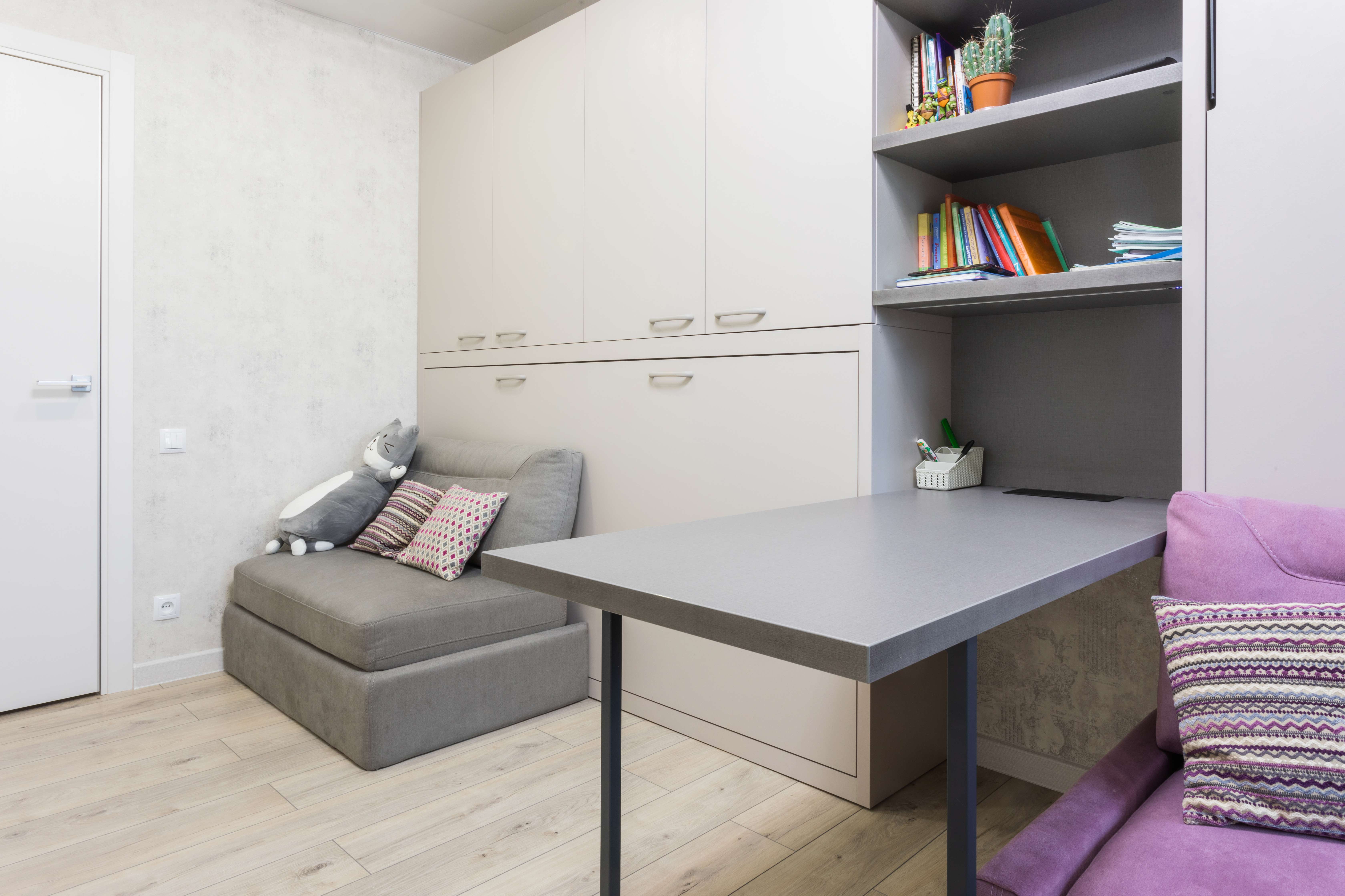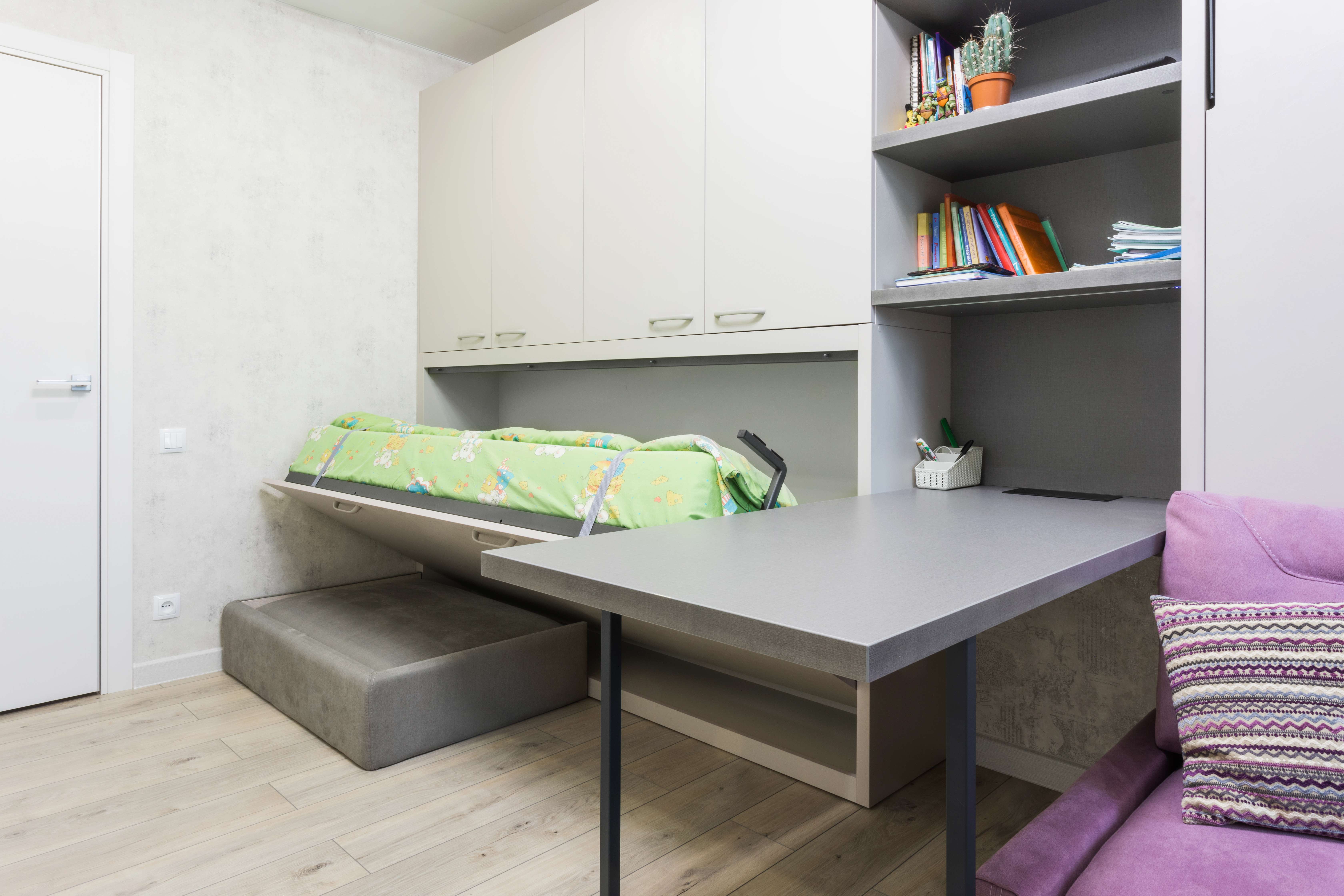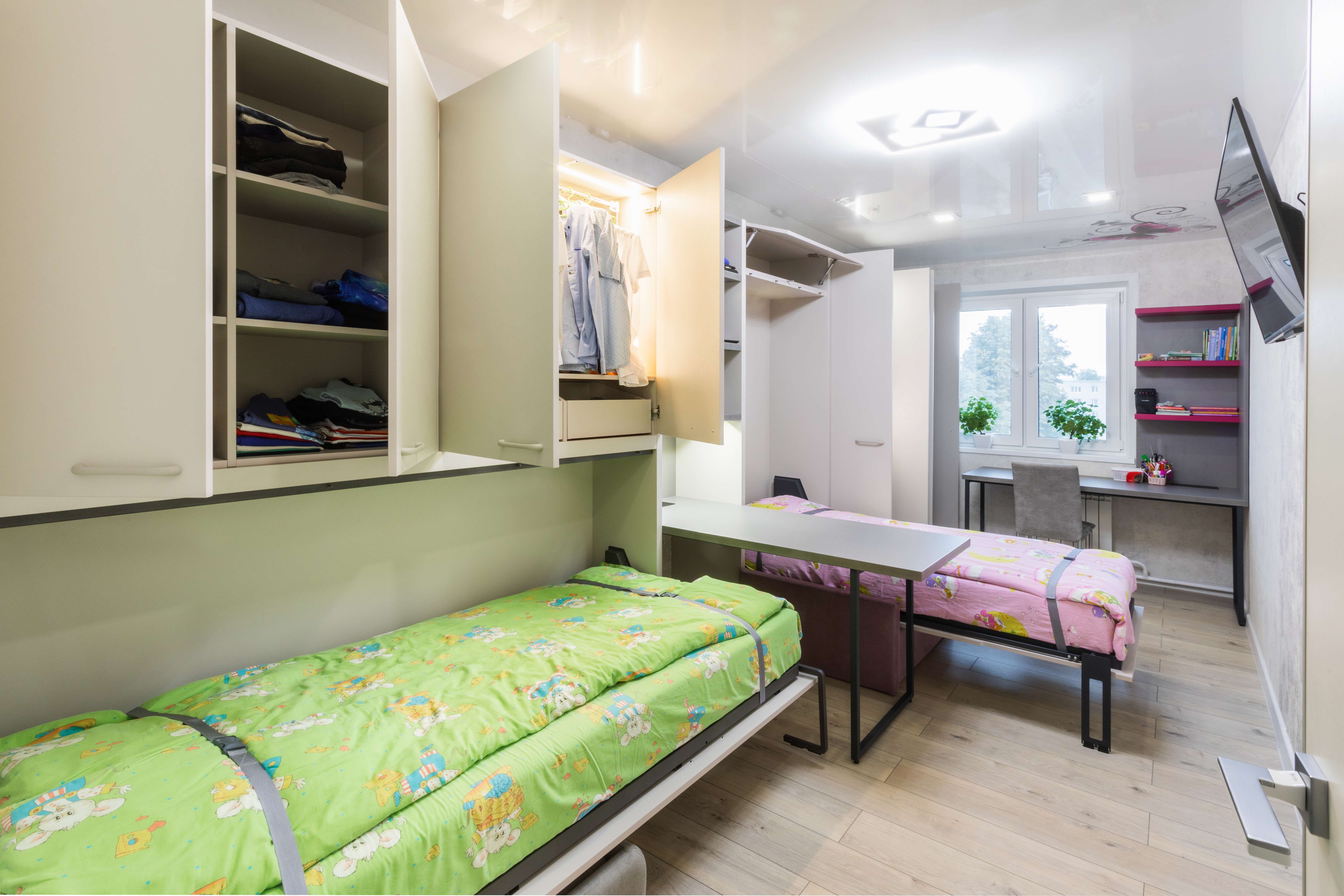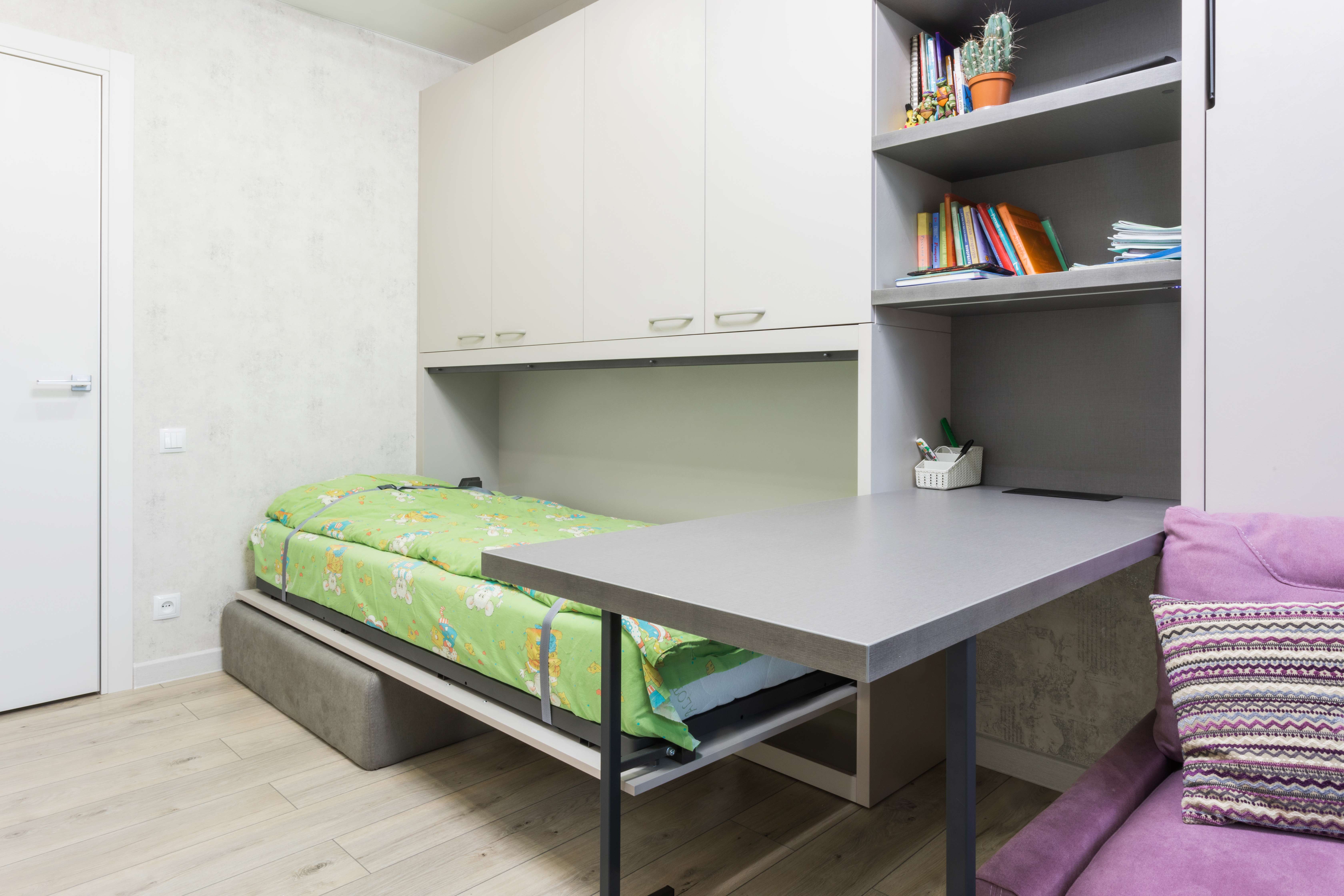 Включает две горизонтальные кровати-трансформеры с мягким изголовьем, рабочий стол и объемную зону для хранения