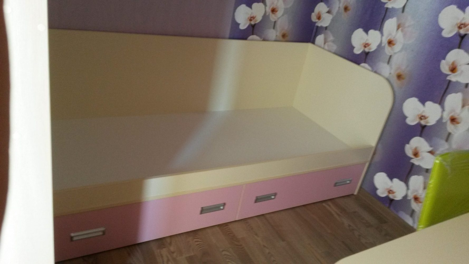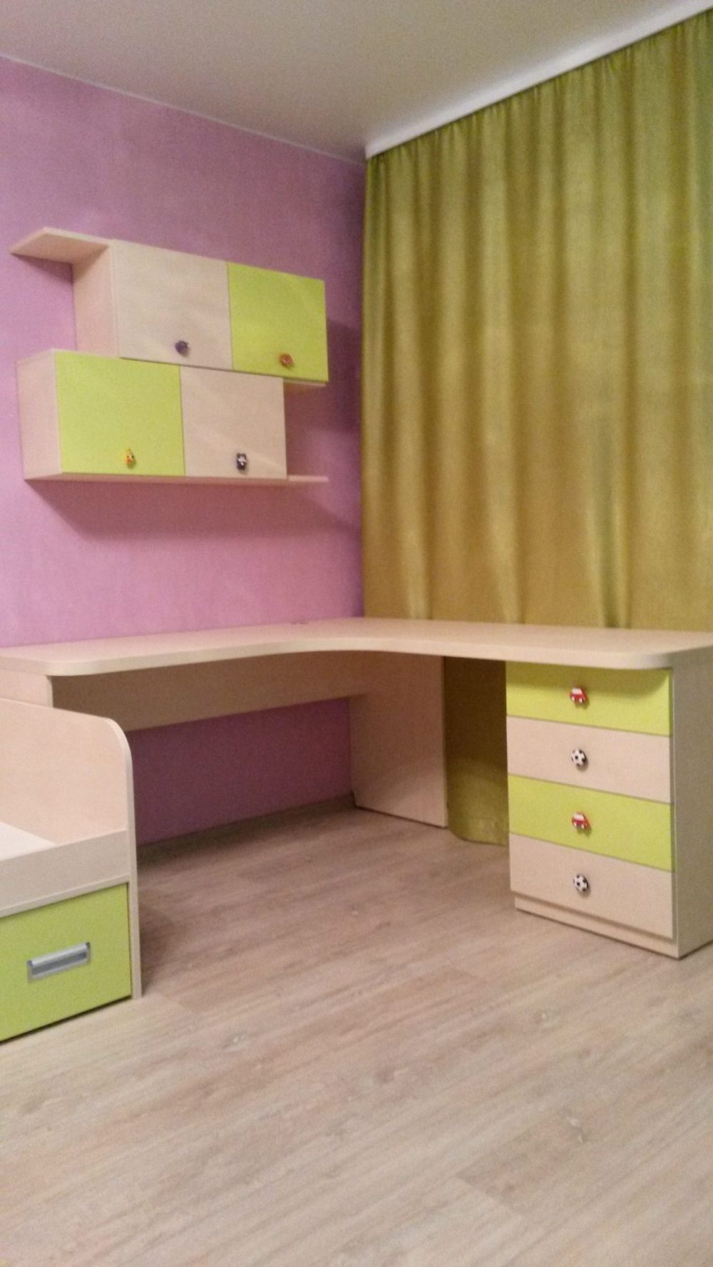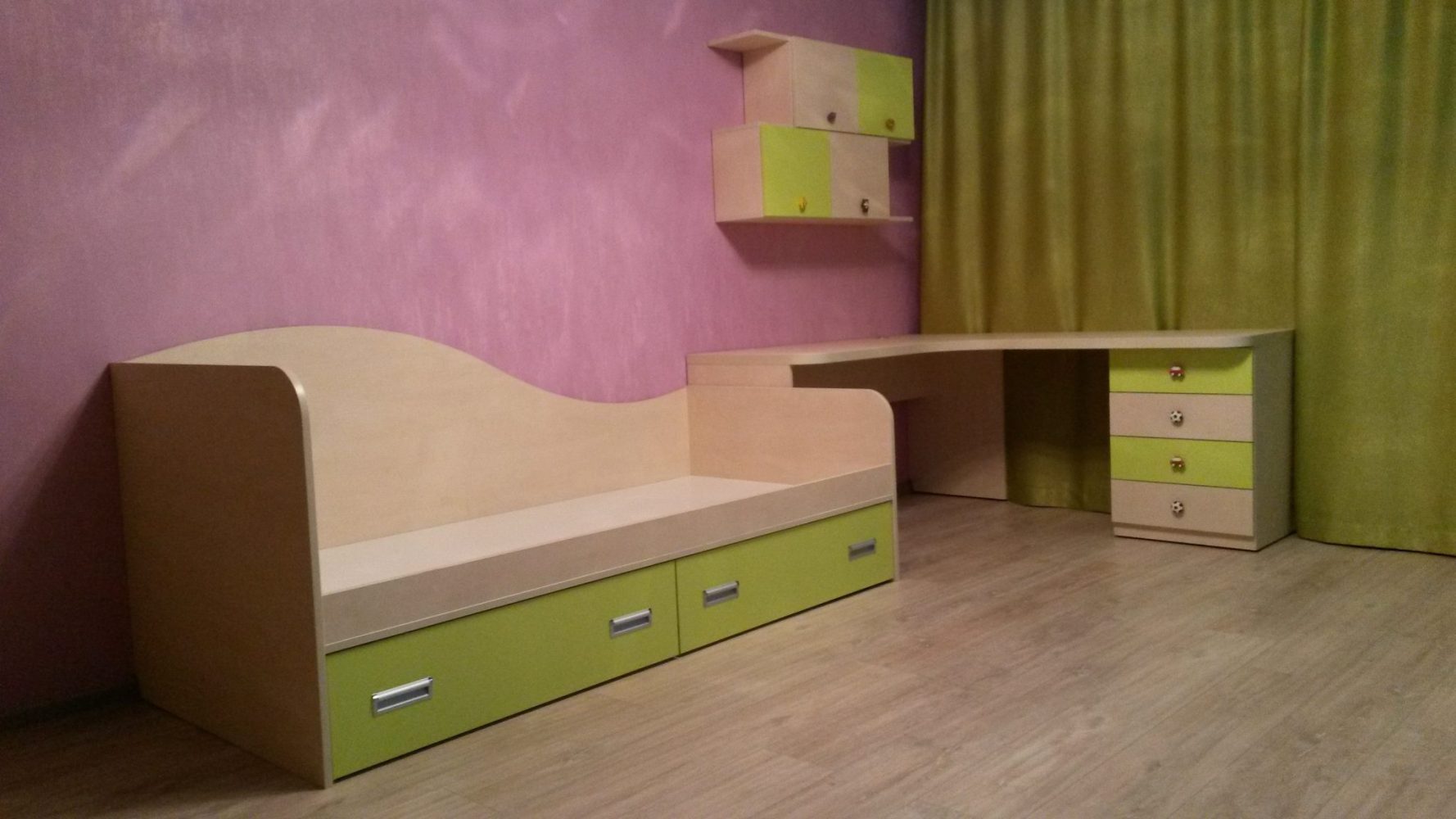 Набор мебели для детской комнаты выполнен в сочетании зеленого и розового цветов. Мебель разделена по цвету семантически, как бы разделяя комнату на личные зоны одного и второго ребенка, а также с помощью цвета в данном примере удалось достичь единого стиля с оформлением комнаты. Вся мебель имеет закругленные углы для достижения бОльшей безопасности для детей.