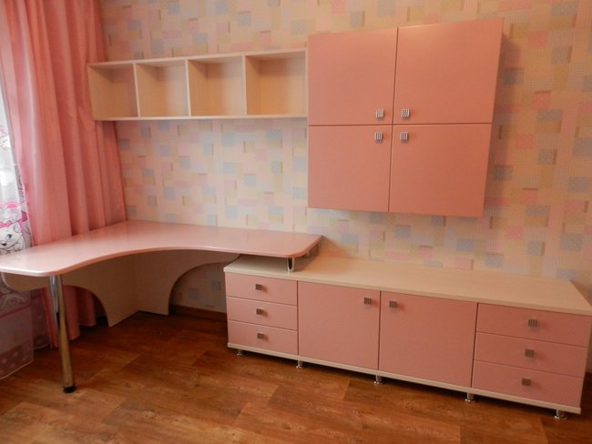 код 99394Угловой стол. Мягкие розовые тона фасадов.