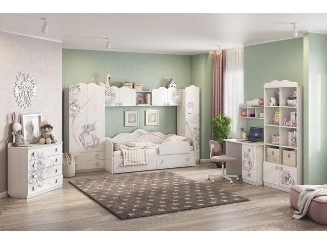 Модульная детская «Фэнтези» - это, прежде всего, дизайн с необычным принтерным рисунком на фасадах, выдержанный в общем стилистическом решении детской. Рисунок устойчив к истиранию и ультрафиолету.
