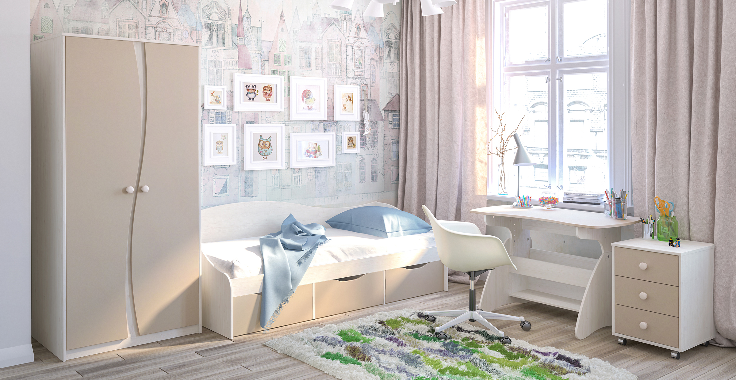 Коллекция модульной мебели для детской комнаты. Материал: ЛДСП, МДФ.