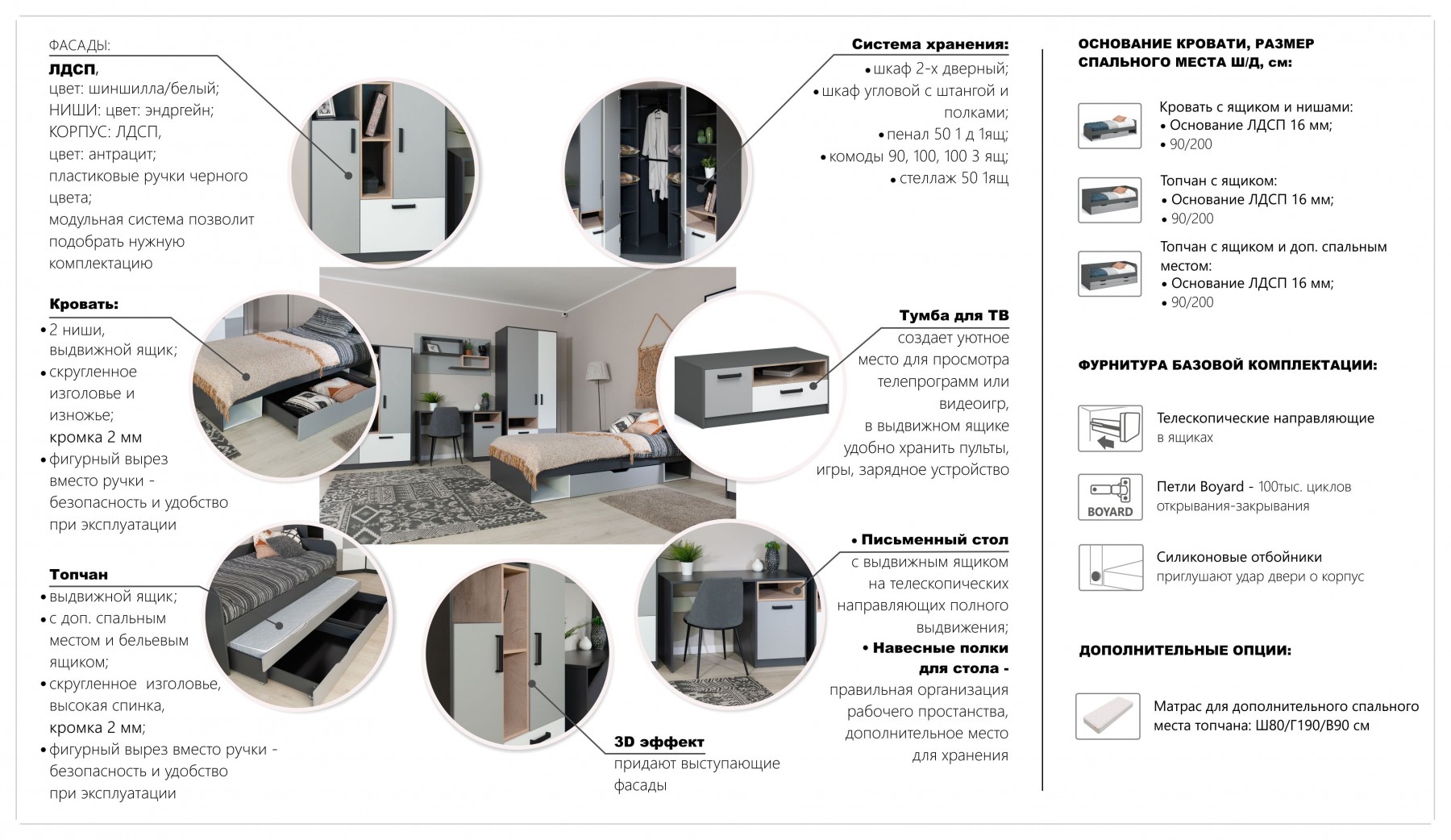 Коллекция мебели в современном стиле для обустройства комнаты подростка. Материал: ЛДСП.