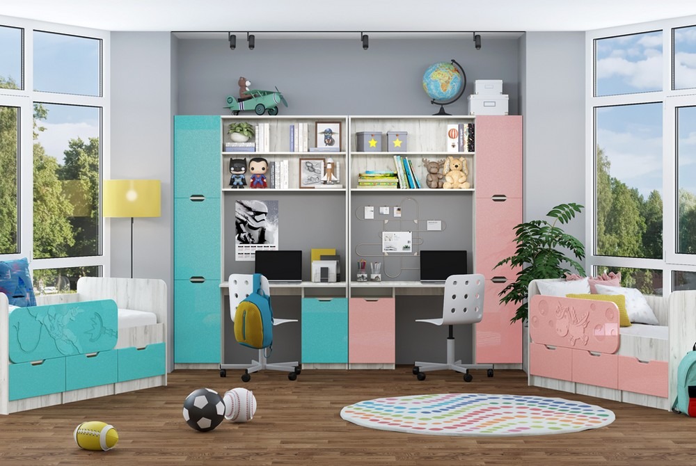 Мебельный гарнитур для детской комнаты с большим выбором модулей и цветовых решений. На картинке показан набор для одного ребенка: шкаф двухстворчатый №1, рабочая зона (стол, пенал, полки), комод угловой, кровать №1 1,632х0,85х0,85 (сп.место) 1,6х0,8 и комод. На других картинках модули которыми можно комплектовать детскую, в зависимости от пожеланий и размеров комнаты.