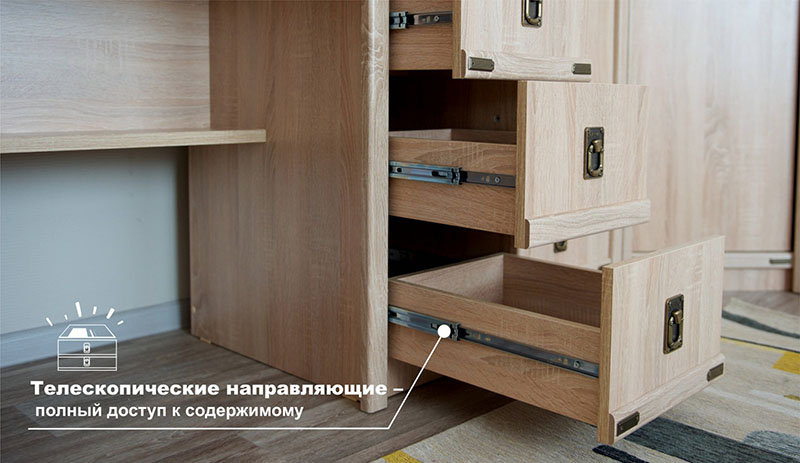 Фурнитура: петли Boyard, телескопические направляющие полного выдвижения, эксцентриковые стяжки, металлические ручки.