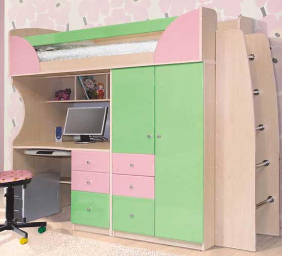 Модель подойдет для комнаты небольшой планировки, ведь в наборе объединены рабочее место, двустворчатый шкаф для одежды и спальное место на втором ярусе. Фасады выполнены в трех цветах: бежевый, розовый, светло-зеленый. Рабочее место предусматривает установку компьютера, оборудовано выдвижной полкой для клавиатуры и тумбой с выдвижными ящиками.