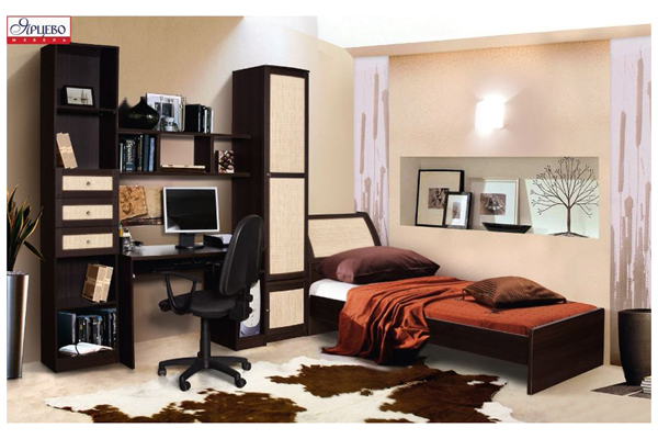 Угловой письменный стол, кровать с ящиками, два пенала, антресоль с полками.