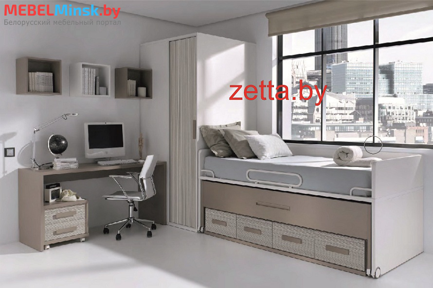 Включает две горизонтальные кровати-трансформеры с мягким изголовьем, рабочий стол и объемную зону для хранения