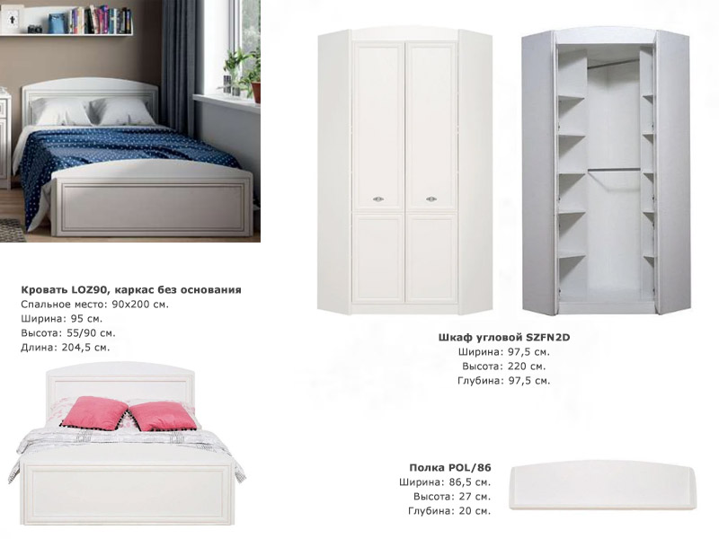 Угловой письменный стол, кровать с ящиками, два пенала, антресоль с полками.