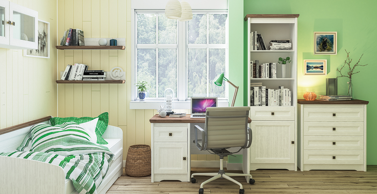 Отличительной чертой стиля «лёгкого кантри» является применение в дизайне не более трёх основных цветов. В качестве основного выступает белый со структурой под дерево, а в противовес ему для создание контраста идёт тёмный цвет с текстурой дуба. Такая универсальная цветовая гамма мебели легко впишется в большинство интерьеров и будет идеальным решением для владельцев любой квартиры или дома.