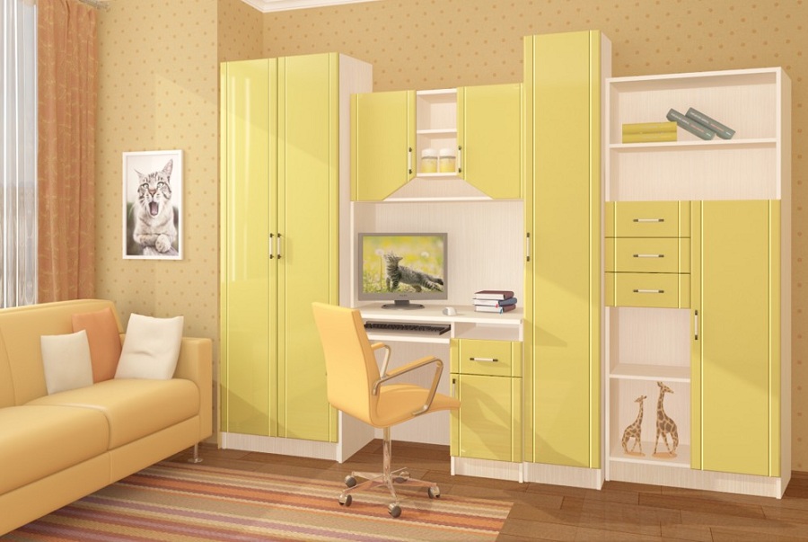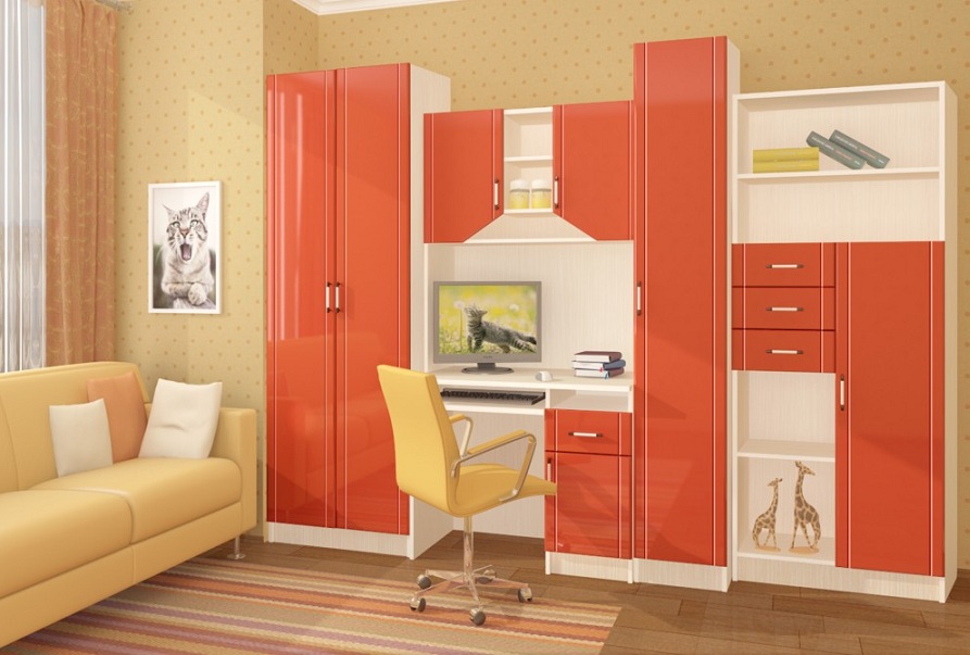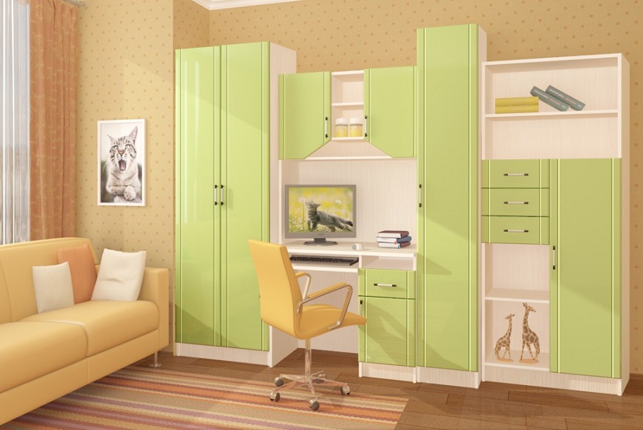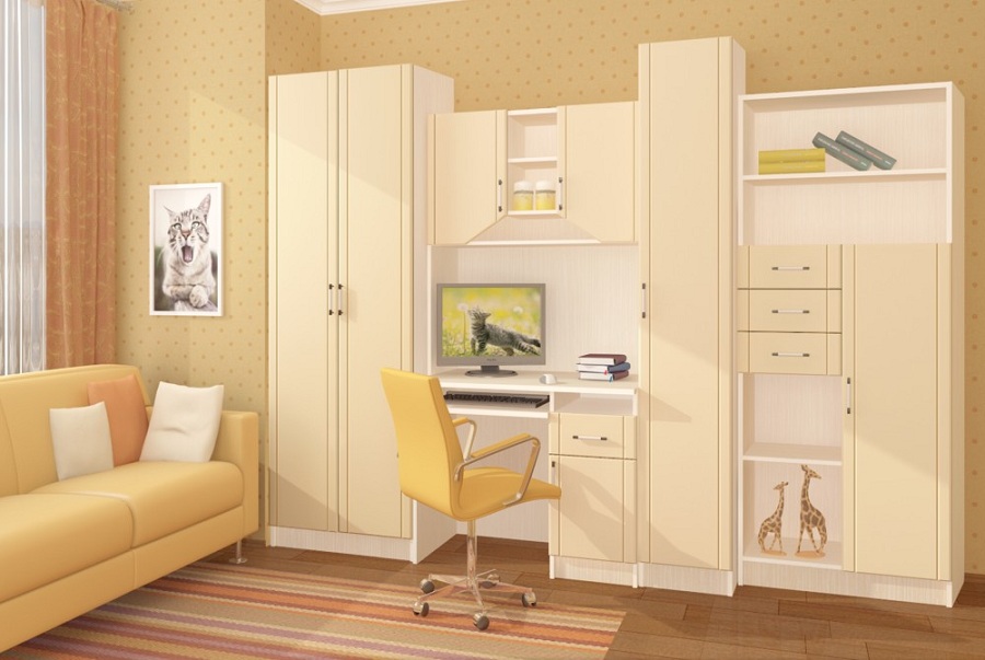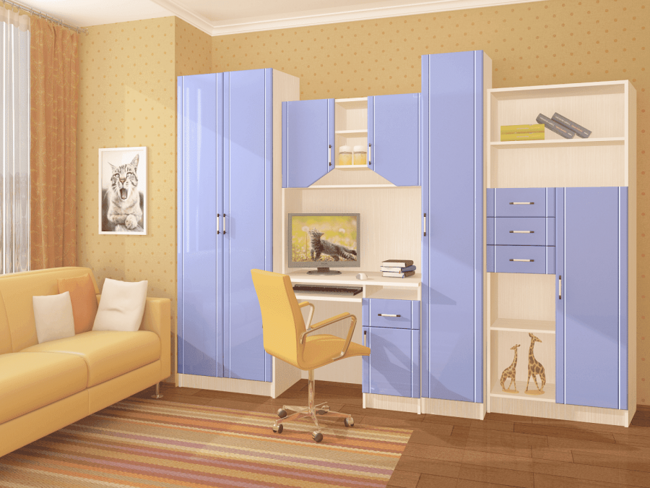 Мебель для школьника. Стол для занятий и размещения необходимых мелочей, много полок для тетрадей и книг, ящиков, вместительный шкаф для одежды.