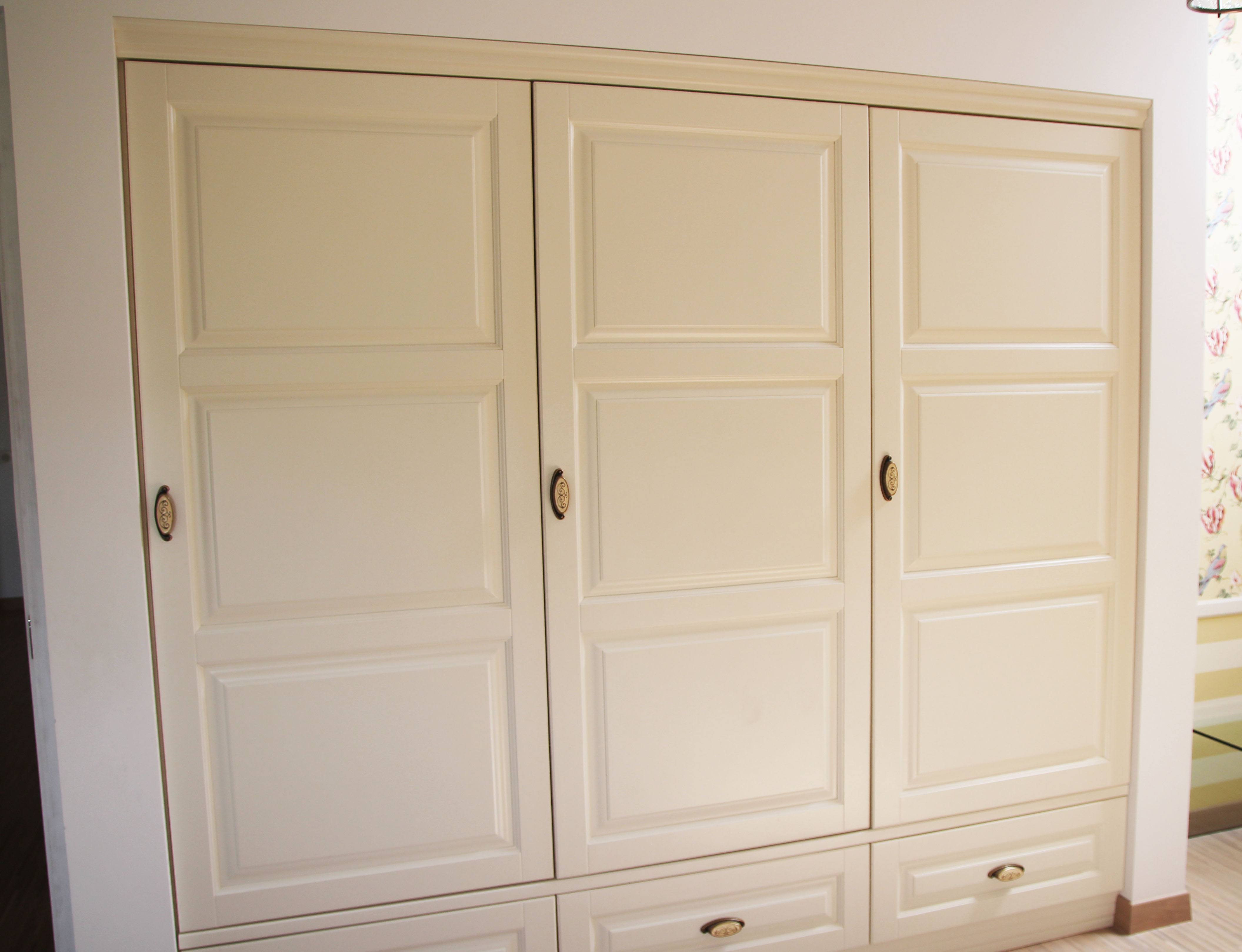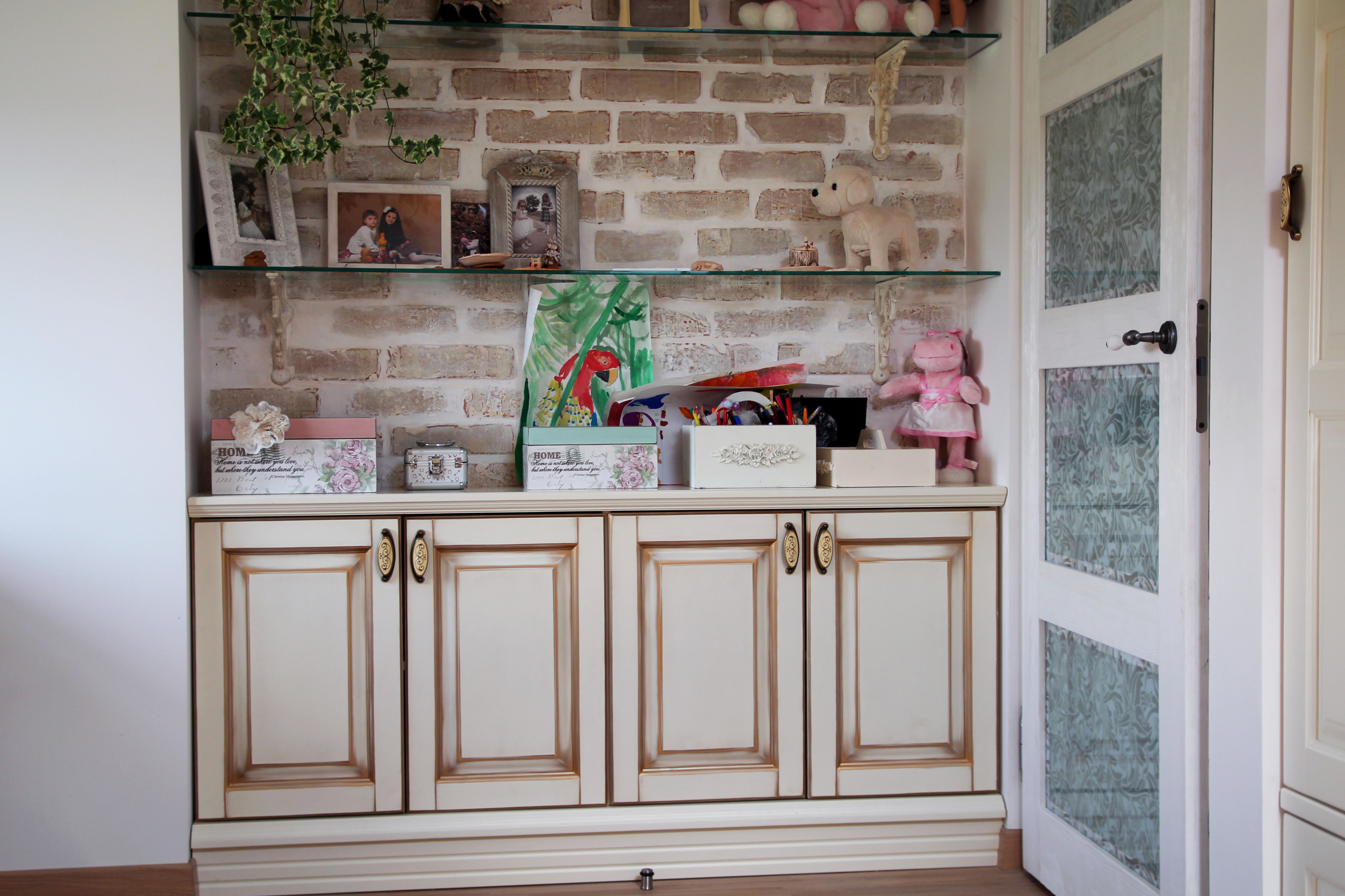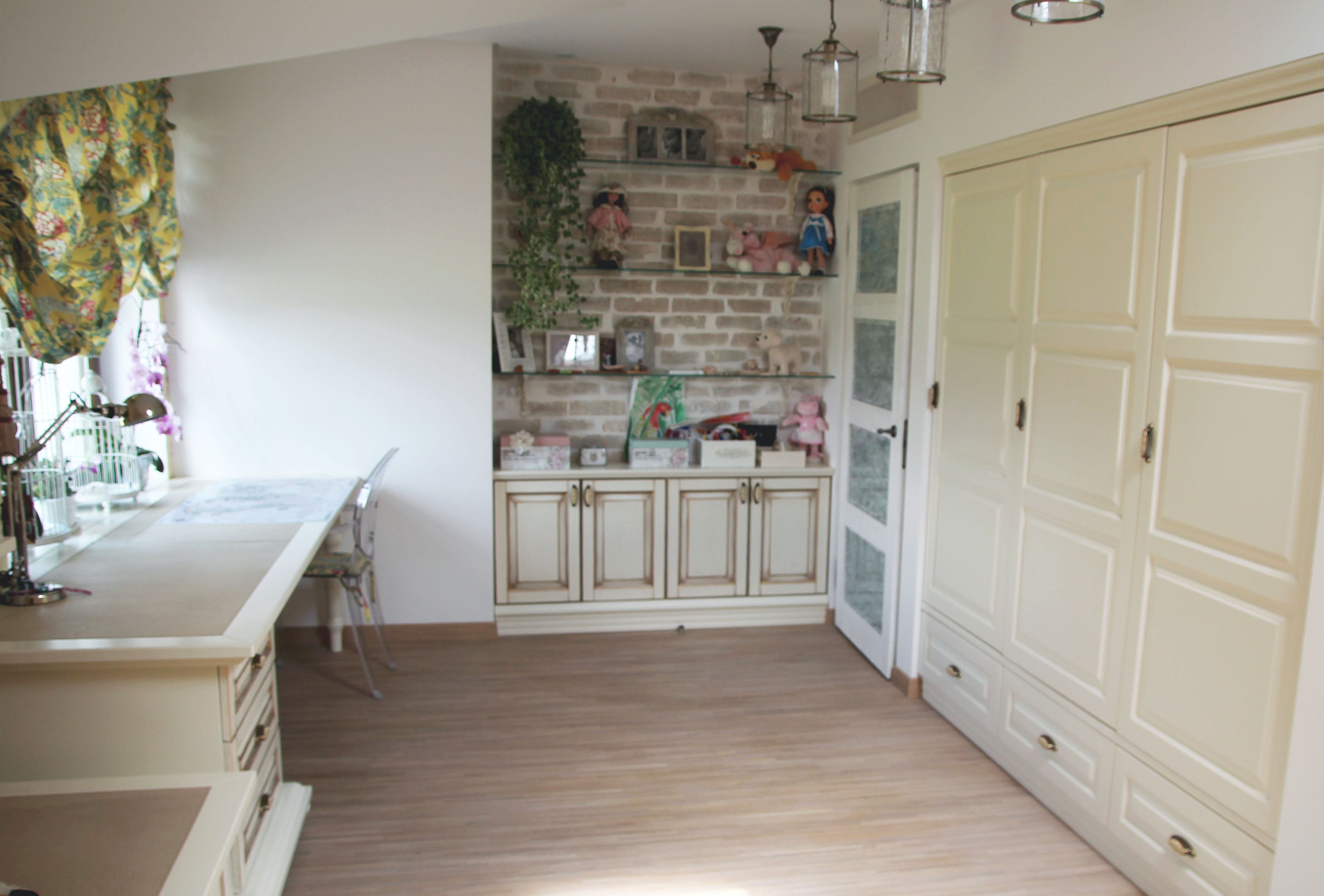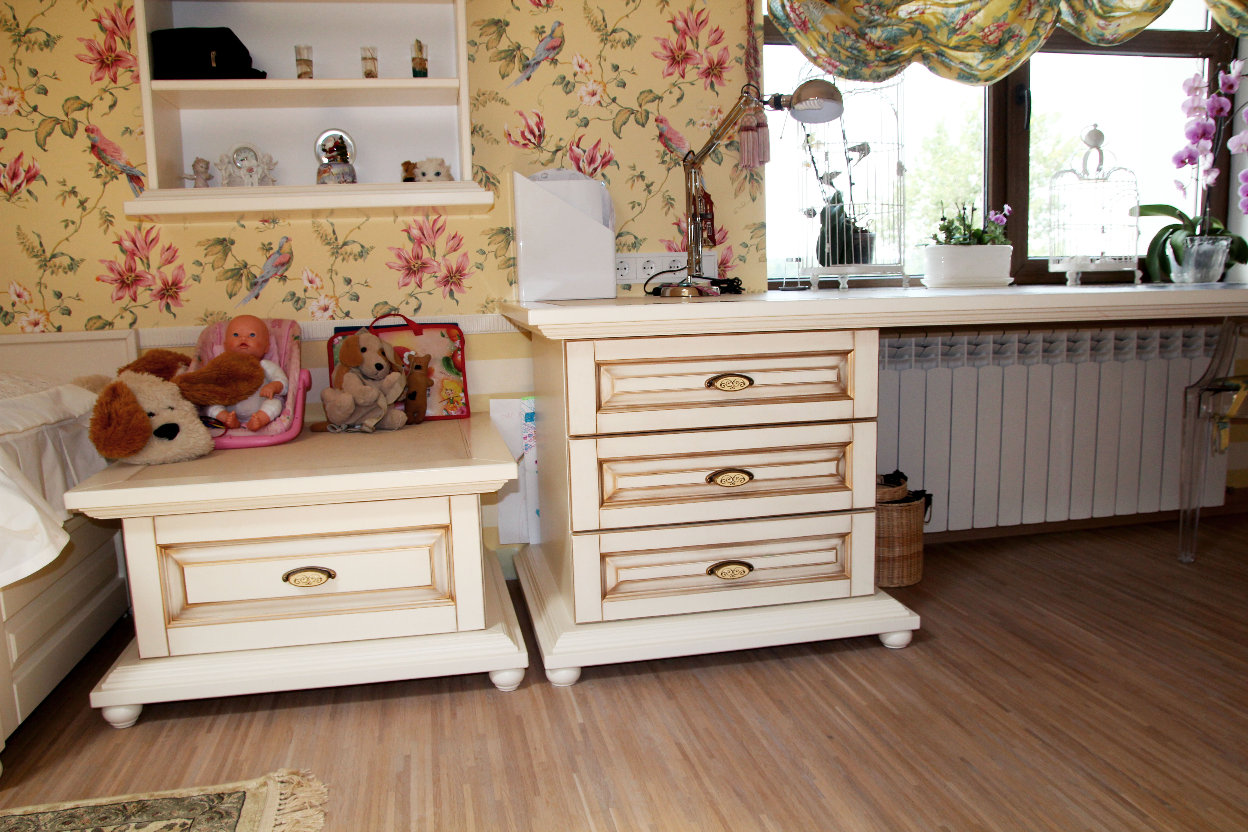 Изысканный набор для детской оформлен в светлом цвете с применением патинирования, придающем набору эффект старины. Фасады шкафа выполнены в светло-бежевом цвете с использованием стильной фрезеровки. Ручки традиционные, с рисунком.