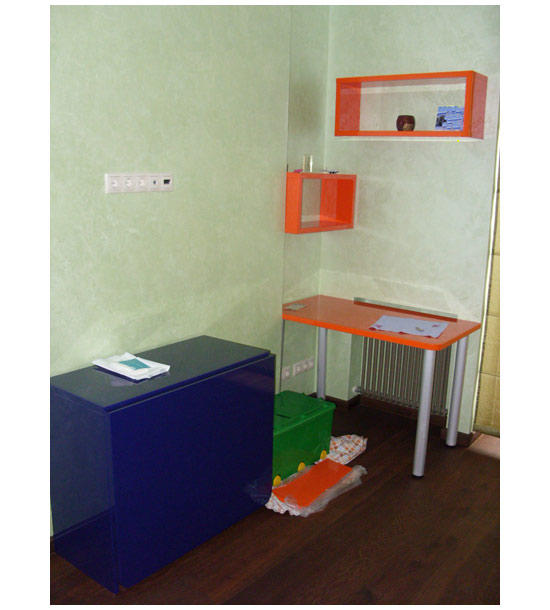 Фасады набора изготовлены из яркого глянцевого материала, который на свету предстает перед нами в ещё более ярком насыщенном цвете. Два спальных места модели расположены перпендикулярно друг другу.